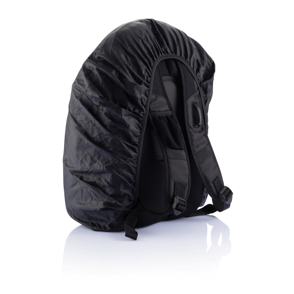1680D polyester laptop backpack with unique balance between comfort and outdoor protection. The backpack has pockets for all your necessities from padded laptop compartment and iPad holder, to pen loops and mesh pockets. On the shoulder strap there is an audio jack to connect your headphone and a sunglasses carrier. It even has a rain cover to protect it all. Registered®