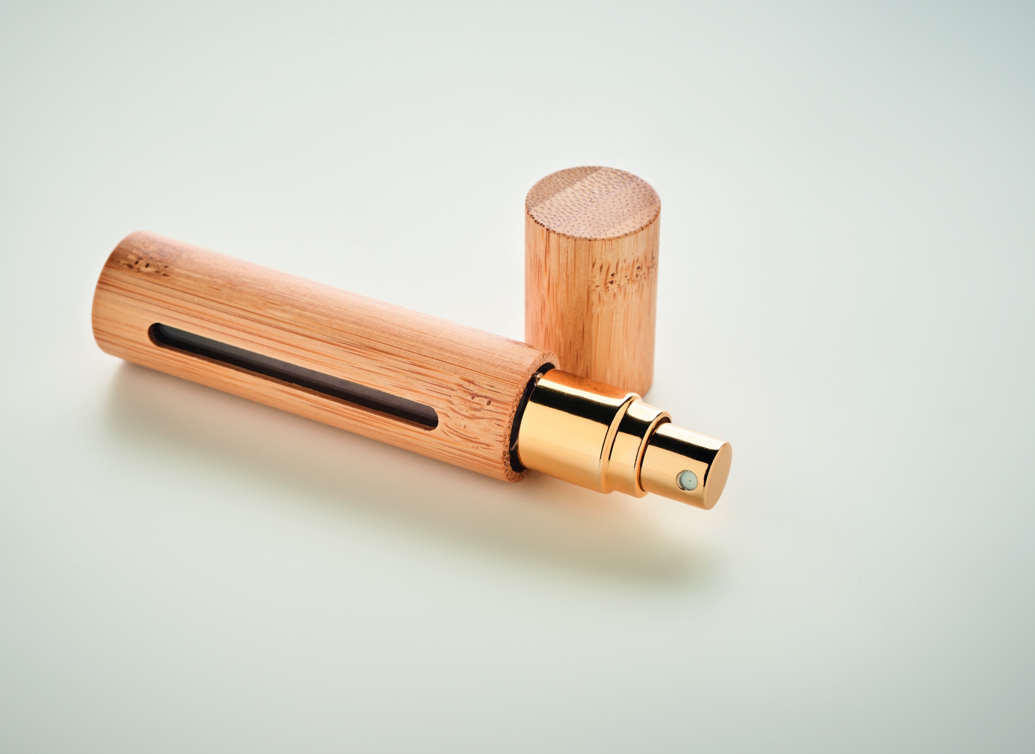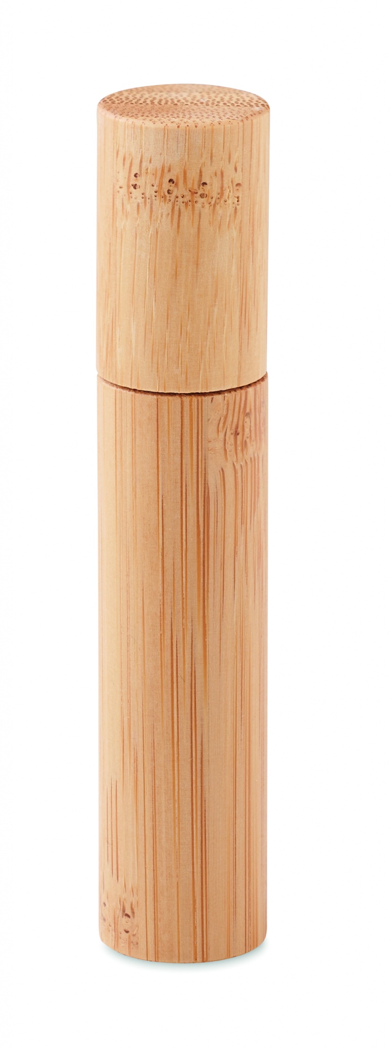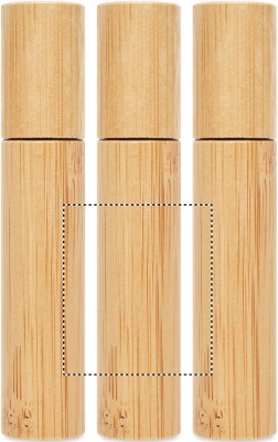 Mini perfume refillable atomiser bottle with bamboo casing. Capacity: 10 ml. Bamboo is a natural product, there may be slight variations in colour and size per item, which can affect the final decoration outcome.