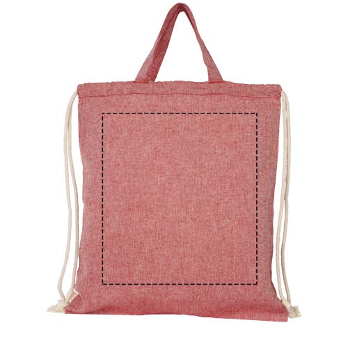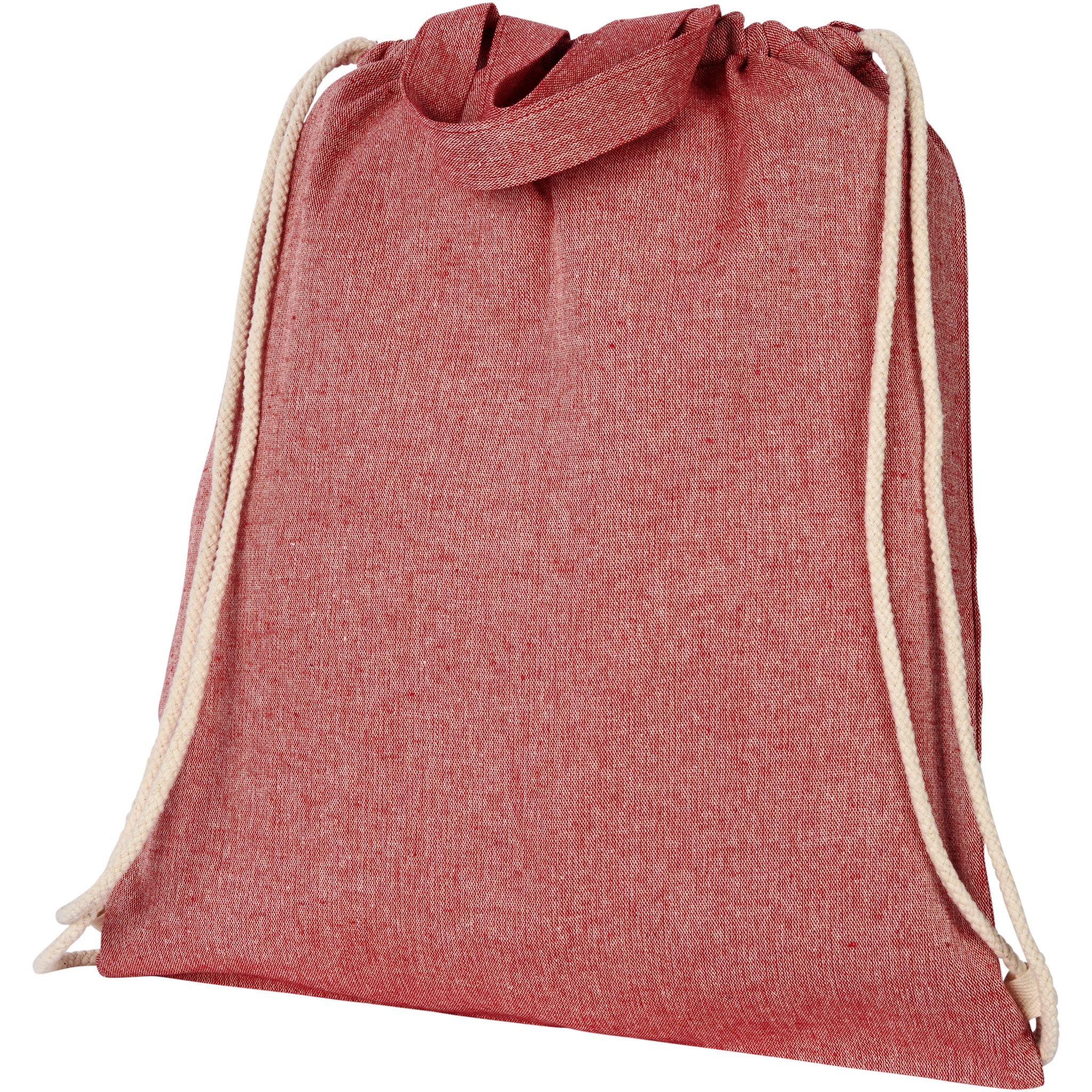 Drawstring bag made of 150 g/m² recycled cotton polyester blend. Recycled cotton is manufactured from pre-consumer waste generated by textile factories during the cutting process. Similar colours are blended together so no additional dyeing is required. Large main compartment with cotton drawstring closure in natural colour. Features two handles with a dropdown height of 14 cm. Resistance up to 5 kg weight. There may be minor variations in the colour of the actual product due to the nature of the production process.