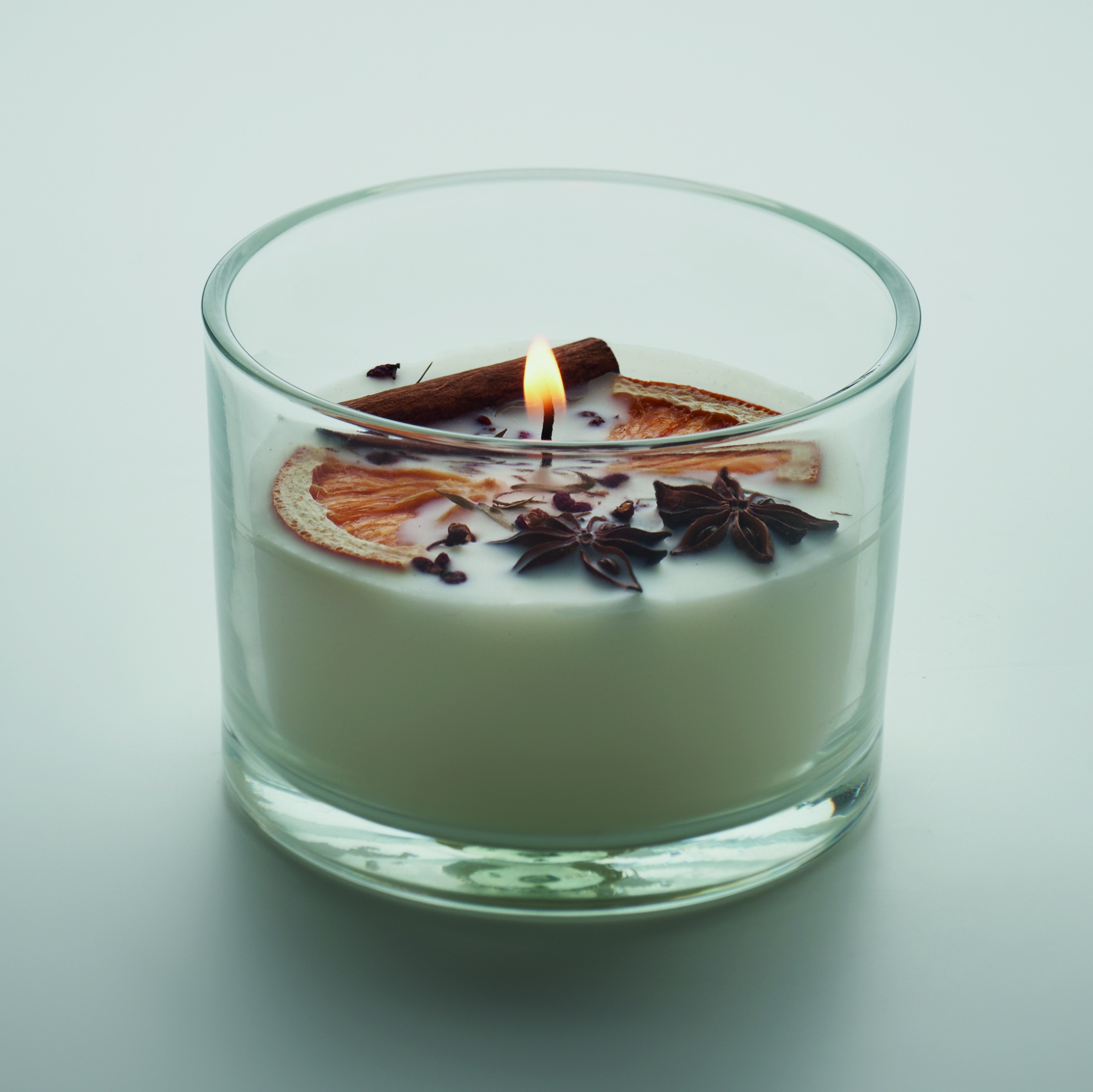 Cinnamon and citrus fragranced plant based wax candle with dried flowers and fruits in glass jar holder. 300 gr. Burn time: 50 hours.