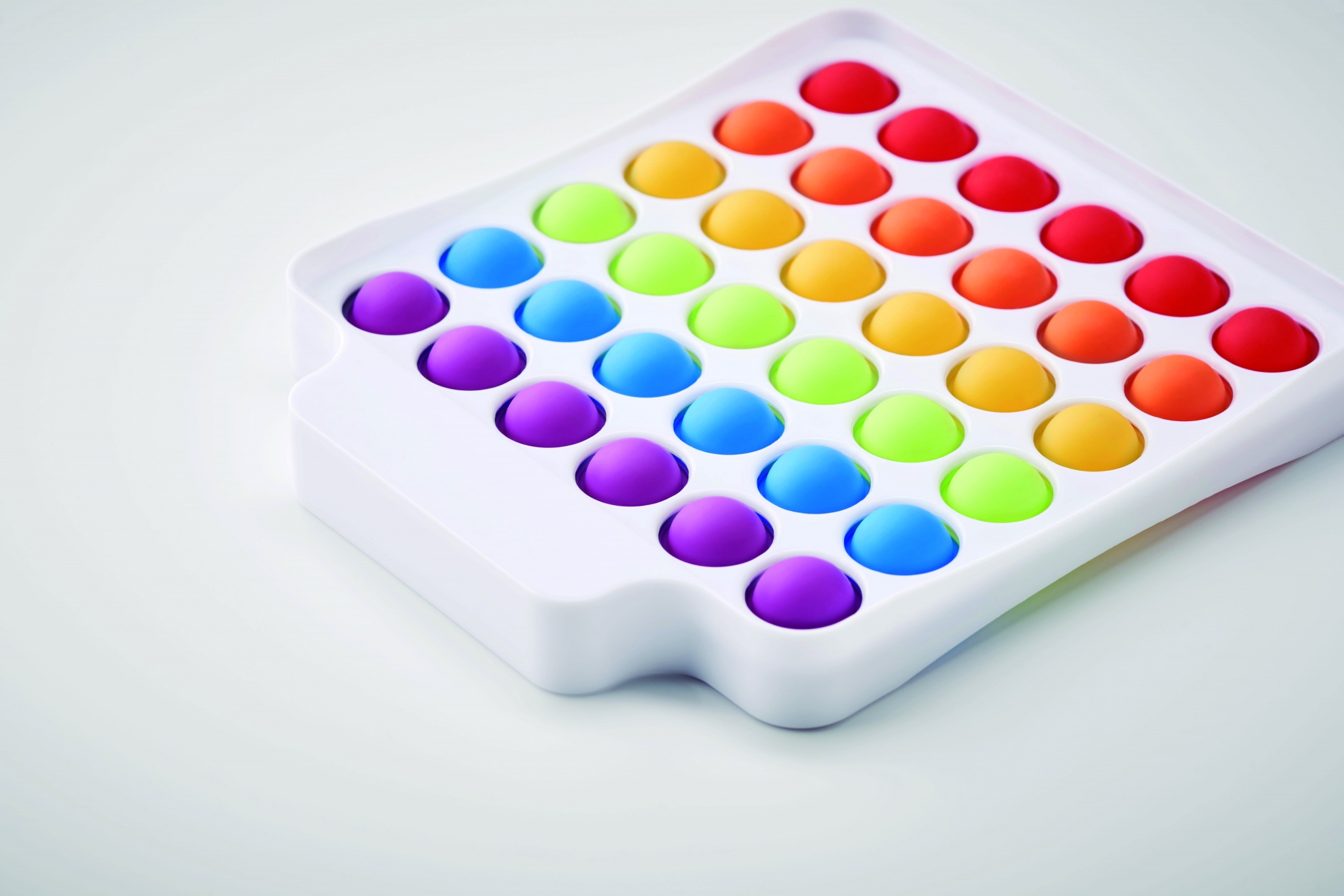 Pop it fidget toy made of coloured silicone and in ABS case with popping bubbles.