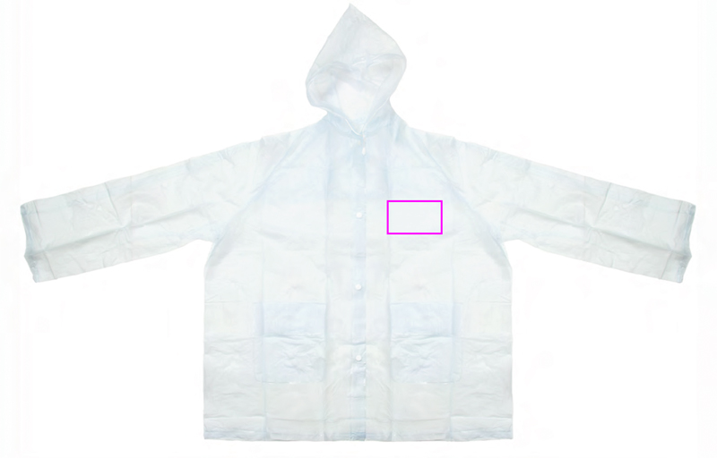 PVC rain jacket (one size XL) transparent frosted with hood, two front pockets and snap buttons. We will print your logo on the chest (heart side).