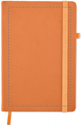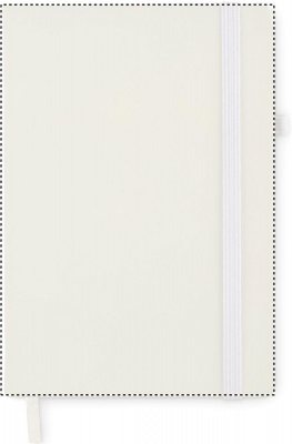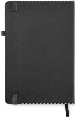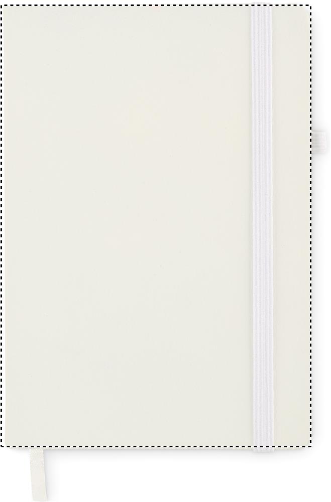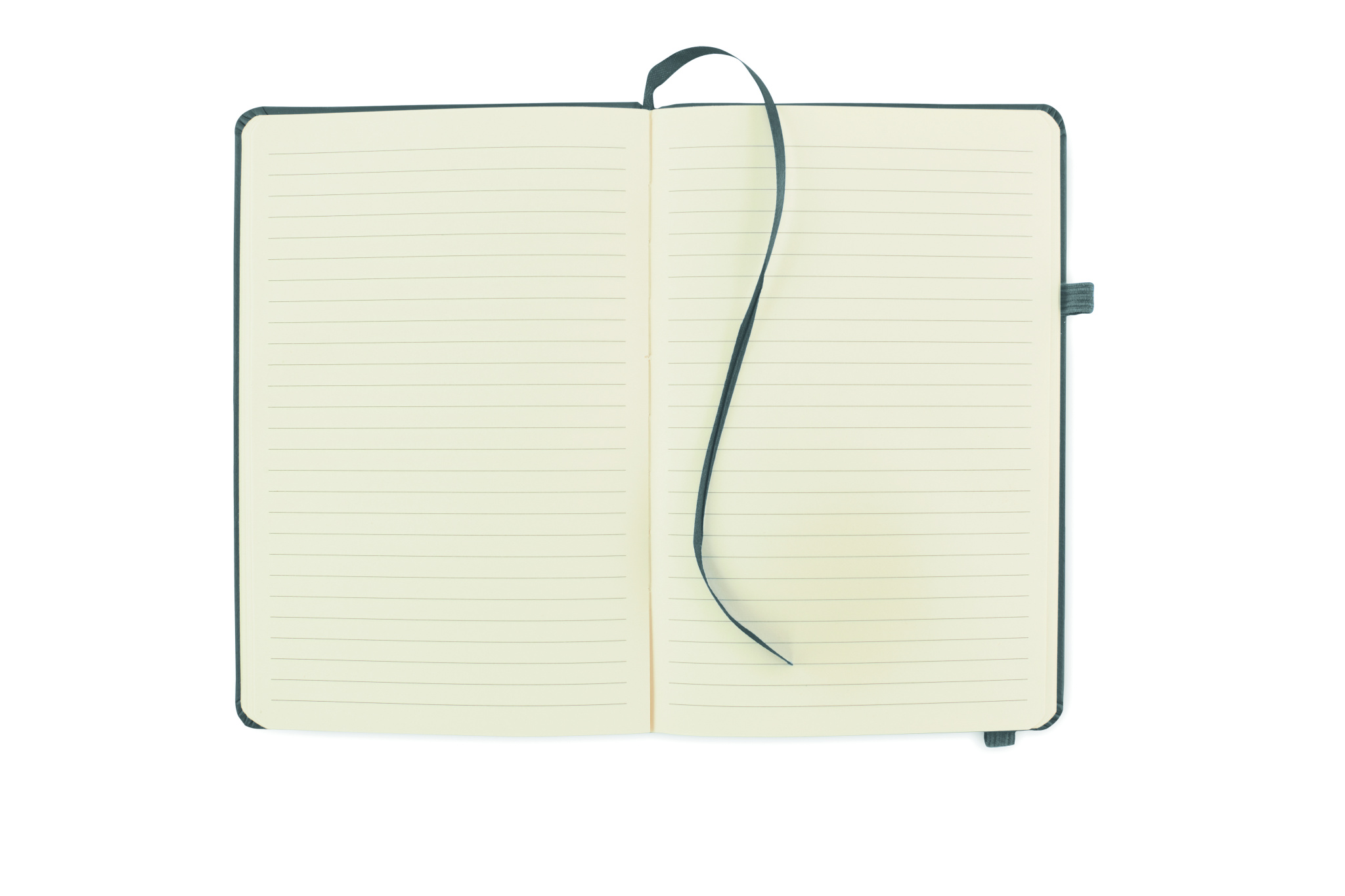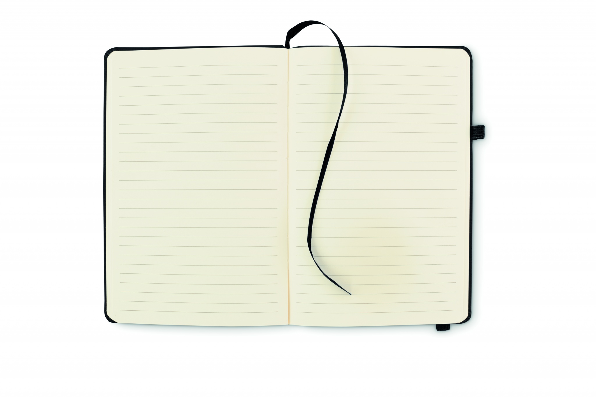 A5 notebook with 70% recycled pre-consumer leather and 30% latex PU cover. Casebound. 192 lined pages recycled paper (96 sheets). Matching elastic closure strap and pen holder.