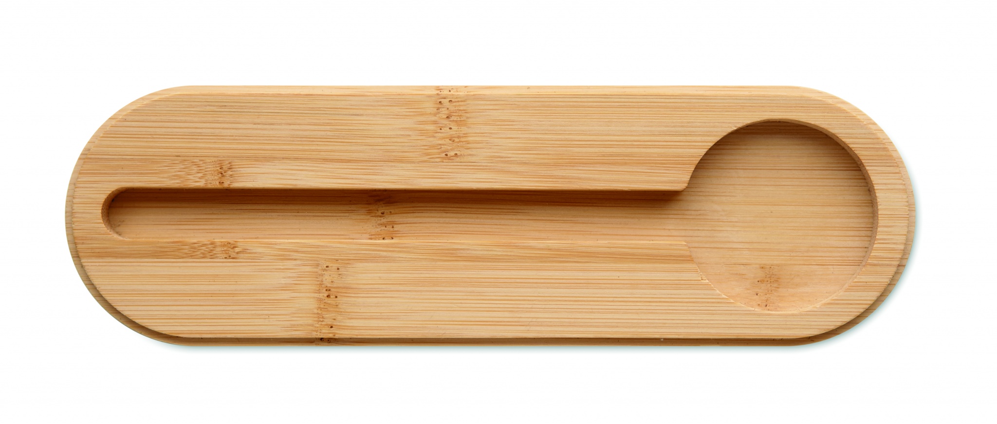 RPET felt pencil case with bamboo lid and integrated phone holder. Ruler: 5,5 inch and 13,5 cm. Elastic closure strap.