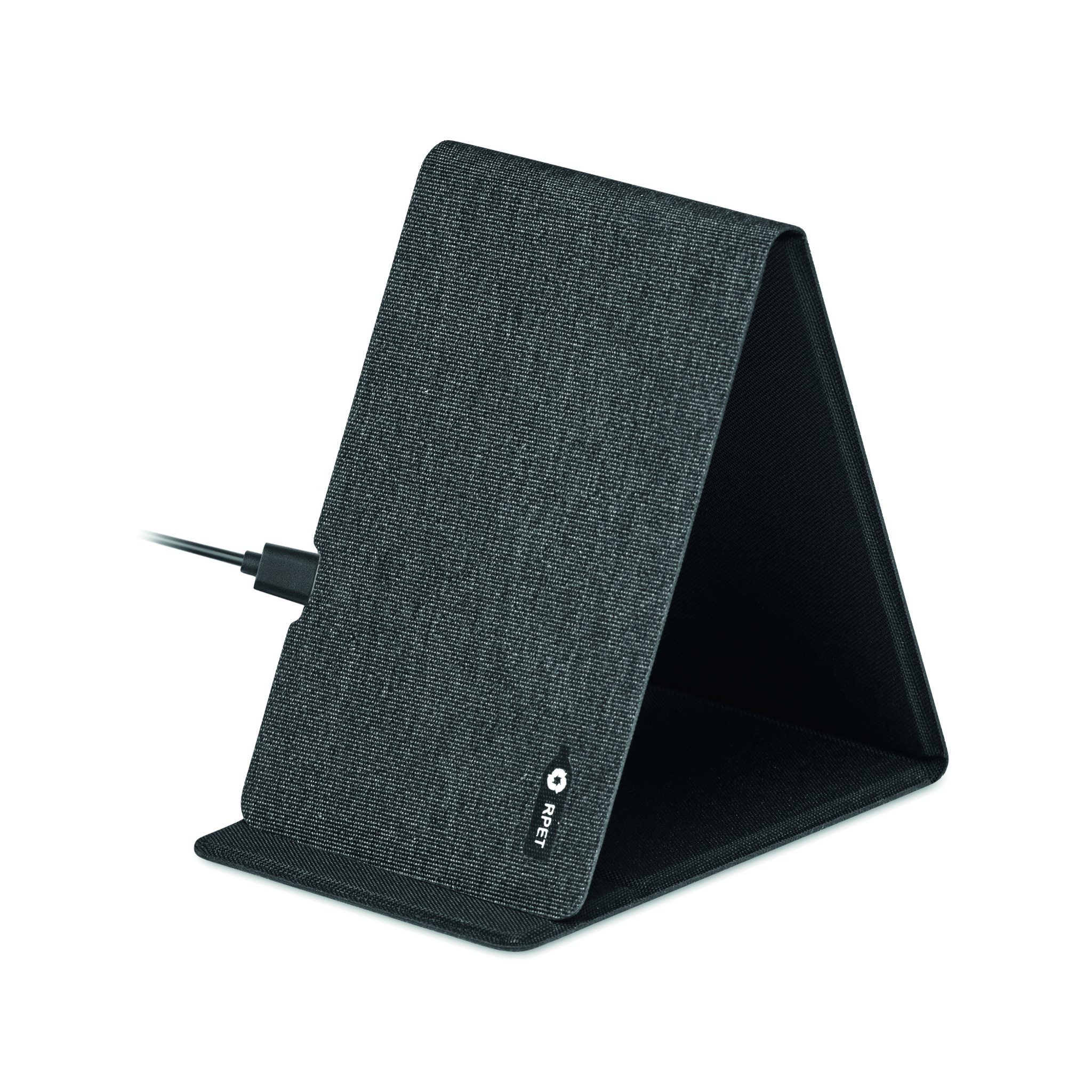 300D 2 tone RPET and 15W wireless charging phone stand. Output: 9V/1.6A (15W) for quick charging. Compatible with latest Androids, iPhone® 8and newer.