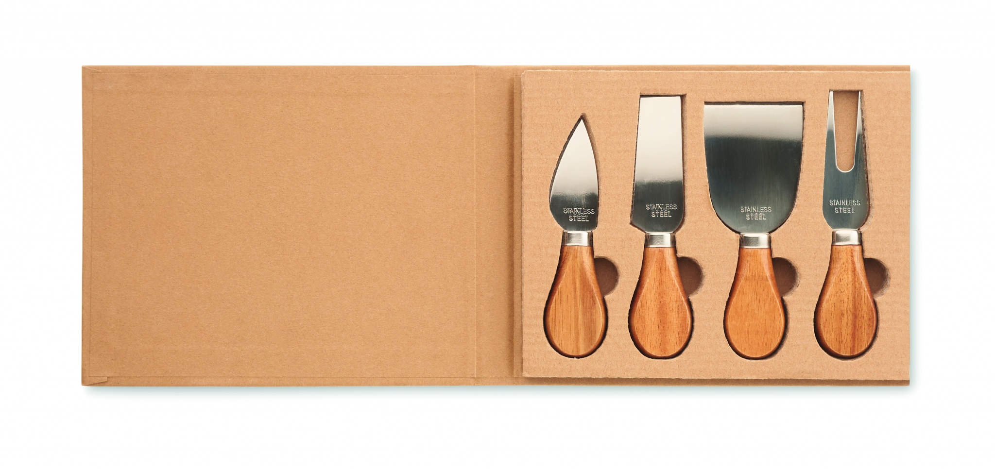 Set of 4 cheese knives in stainless steel and rubber tree wood handles. Presented in corrugated carton giftbox. Wood is a natural product, there may be slight variations in colour and size per item, which can affect the final decoration outcome.