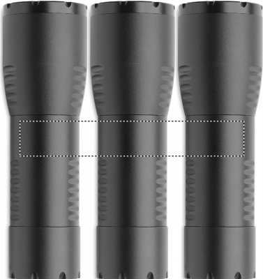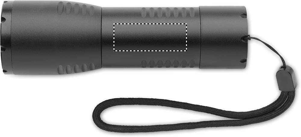 Small aluminium zoomable LED flashlight torch and detachable strap. Output: 200 lumen. 3 AA battery excluded.