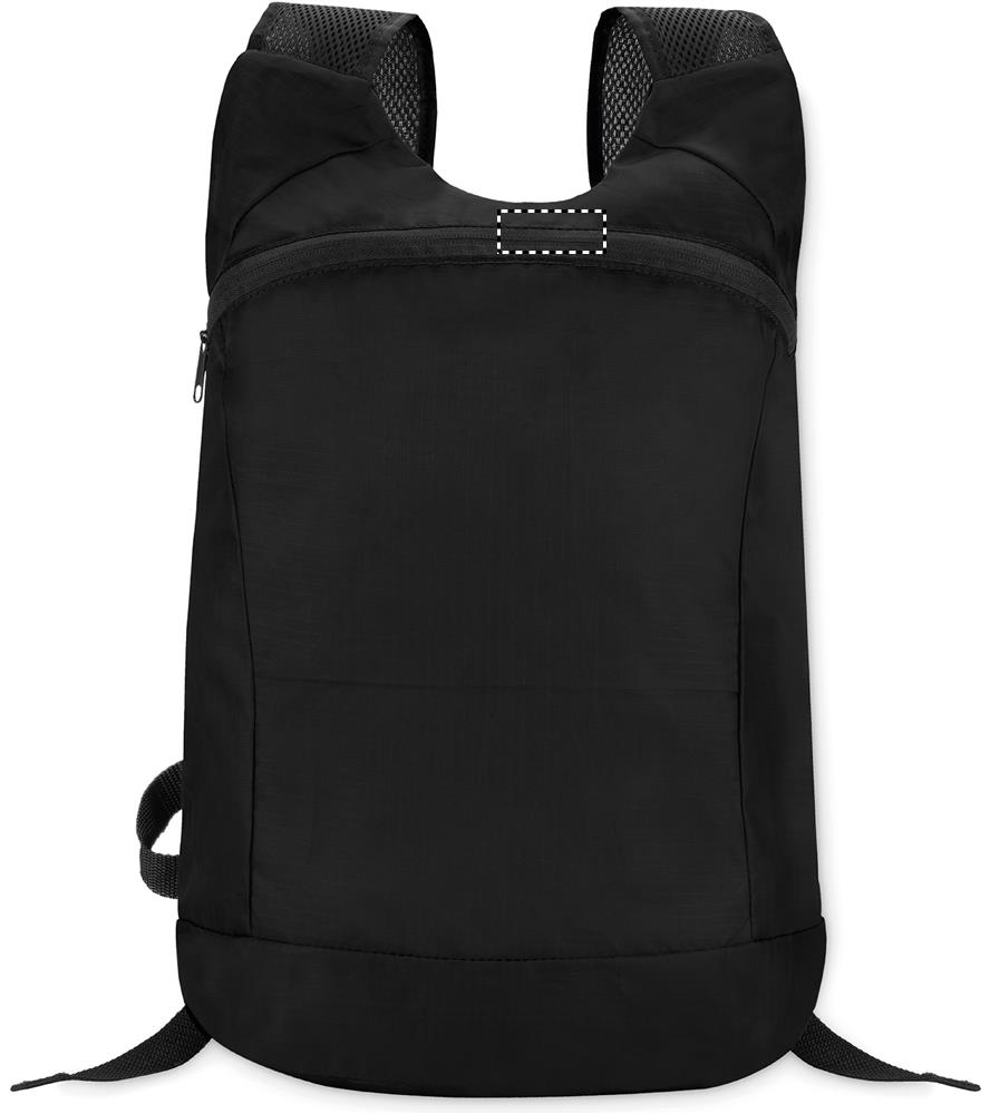 Foldable sports rucksack in ripstop polyester with zippered front opening, mesh shoulder strap and detachable pouch.