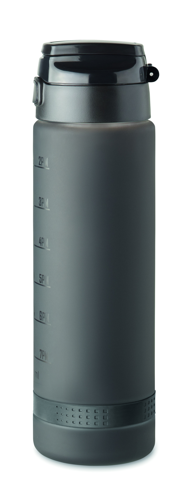 Sports water bottle in RPET, motivational time markings, one hand opening flip top lid, safety lock and carrying strap. Capacity: 1L.