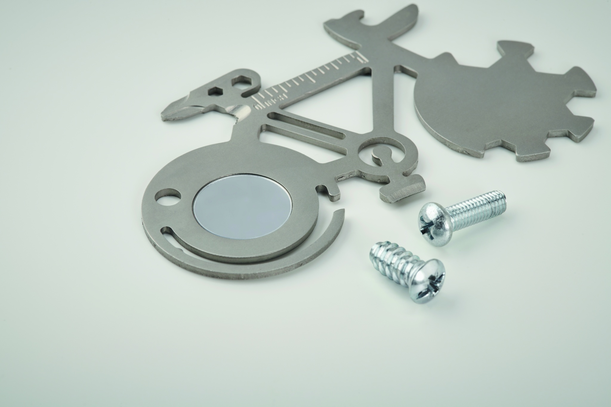 Multi-tool 11-in-1 stainless steel bicycle shaped. From bottle opener, knife, ruler or Phillips screwdriver tools.