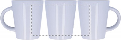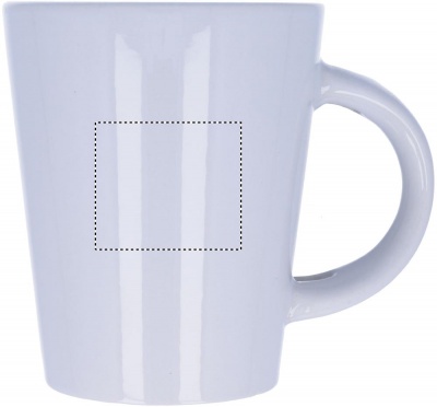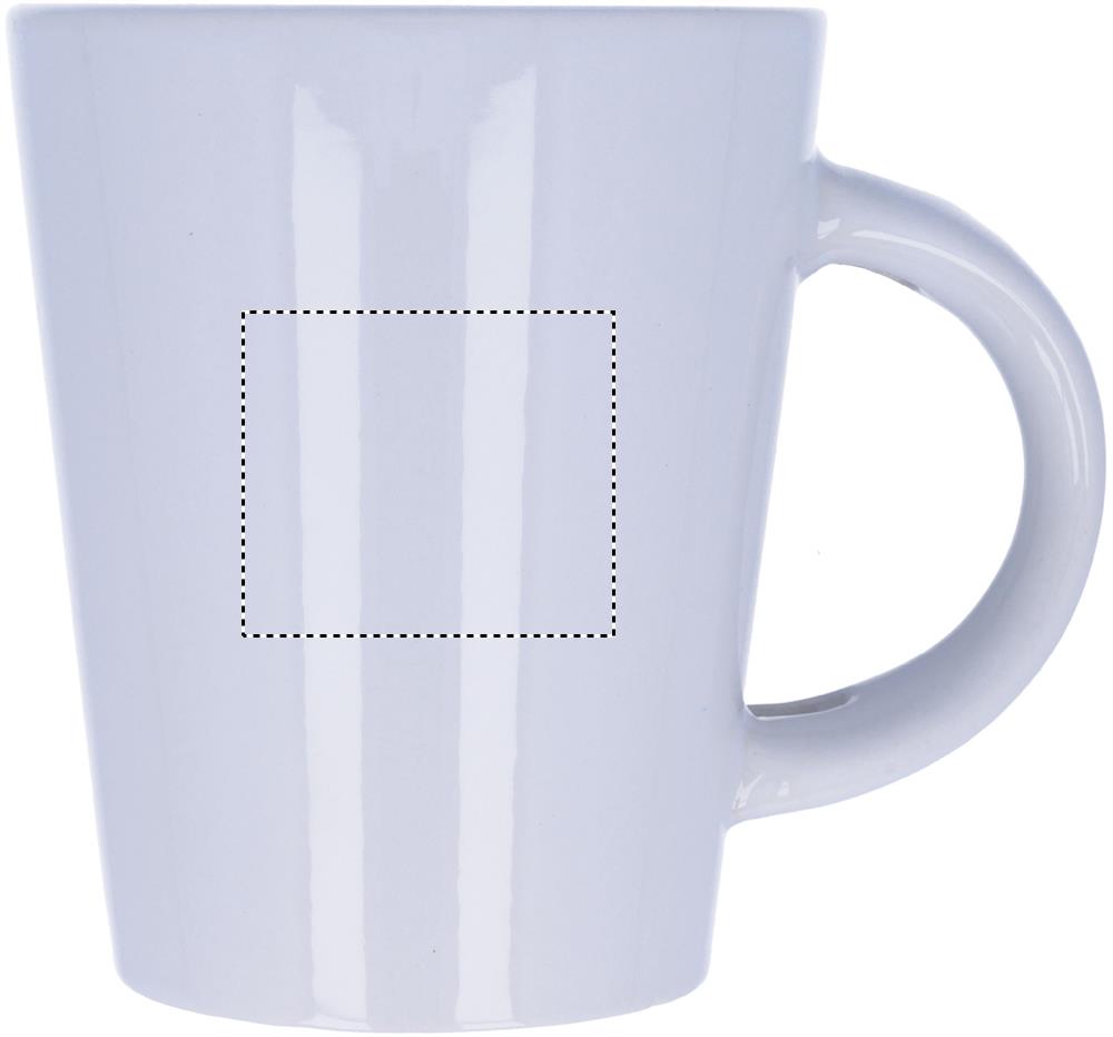 Stoneware mug of 300 ml capacity with special coating for sublimation printing. It has a spoon on handle. Individual packing in white carton box.
