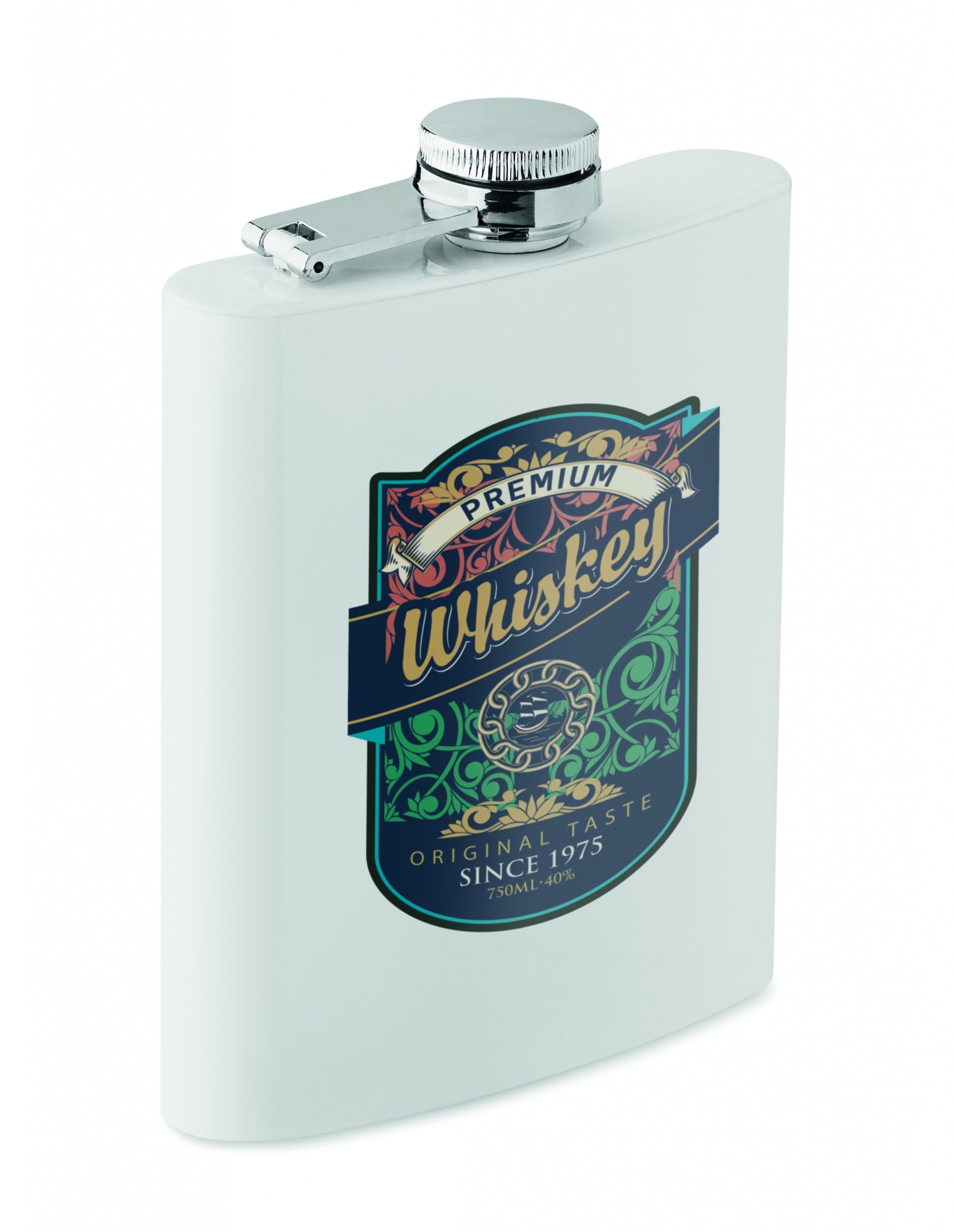 Slim hip flask in recycled stainless steel (90% recycled stainless and 10% stainless steel) with sublimation layer. Single wall. Capacity: 180 ml.
