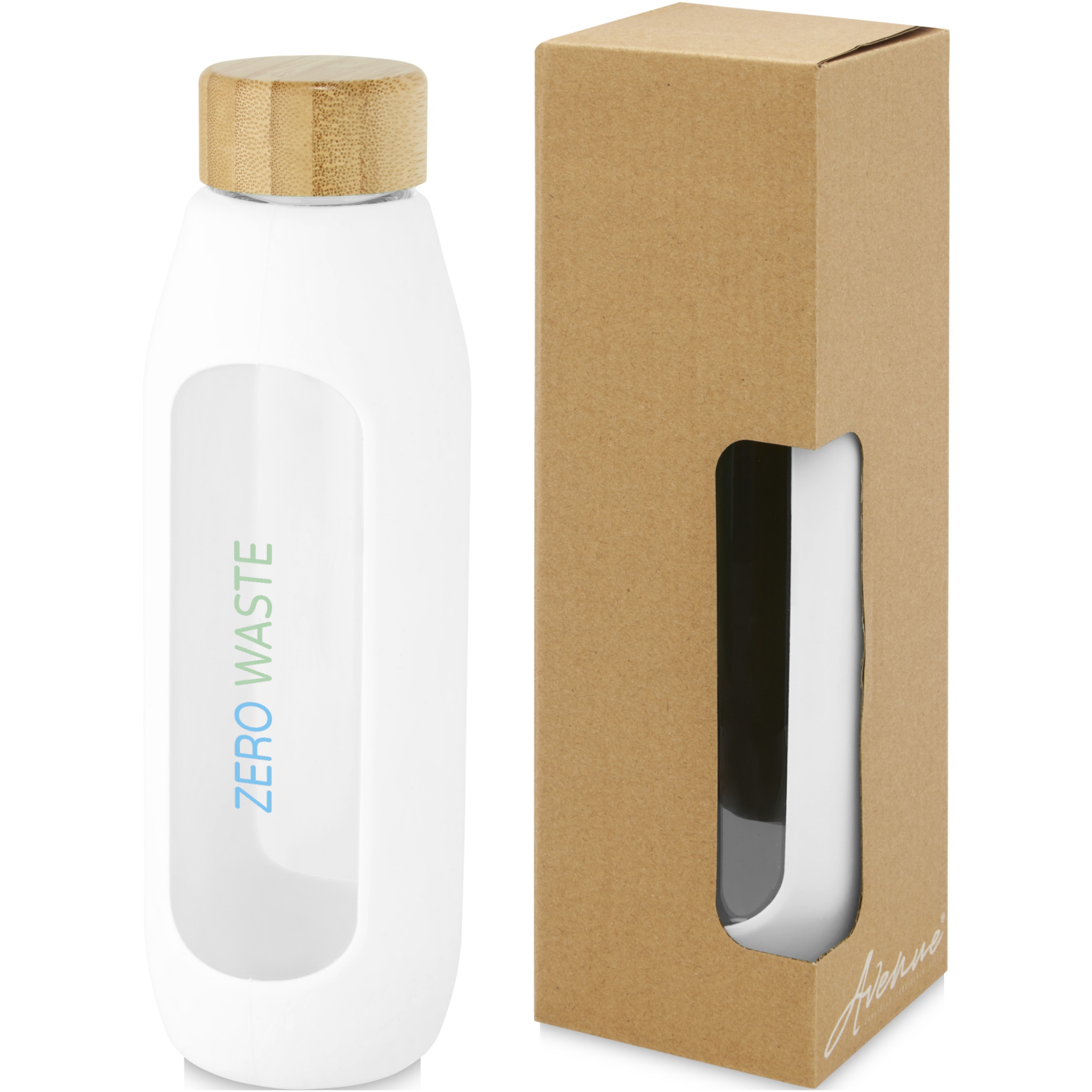 Eco friendly reusable water bottle that provides a pure water drinking experience. The bottle is made from durable borosilicate glass which conserves the pure real fresh taste of water, and it does not any contain harmful chemicals. Features a silicone grip with a leakproof lid made of organic bamboo. Tested and approved under German Food Safe Legislation (LFGB), and tested for phthalates content according to REACH regulations. Volume capacity is 600 ml. By removing the grip and lid the bottle is dishwasher safe. Presented in a recycled cardboard gift box.