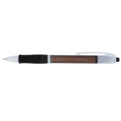 Colourful click action ballpoint pen with transparent barrel and matching colour rubberized grip.