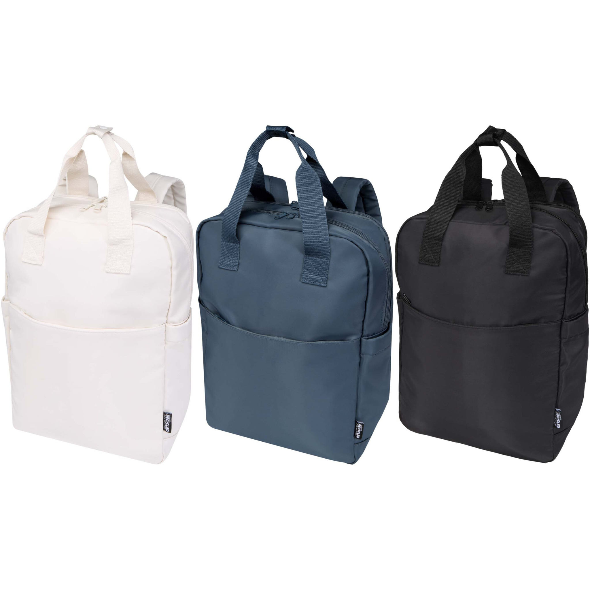 The Trip Aware™ recycled travel laptop backpack is a compact, lightweight backpack designed for streamlined travel and everyday use. Made from durable 290D twill polyester with a soft knitted backing and lined with RPET 210D/PU, it combines functionality with a clean, practical design. It features two side pockets for water bottles, dual carry handles, and comfortable shoulder straps. The front zip pocket includes organised storage for a passport, pens, and a ribbon for keys, while the main compartment fits a notebook or tablet. A separate 14” laptop compartment and a trolley sleeve on the back make it especially suitable for travel. Each bag also comes with an Aware™ tracer. This innovative feature allows users to trace the origins and journey of their item through a QR code, enhancing transparency in the supply chain and fostering a stronger connection between the product and its production process. Volume capacity: 9 litres.