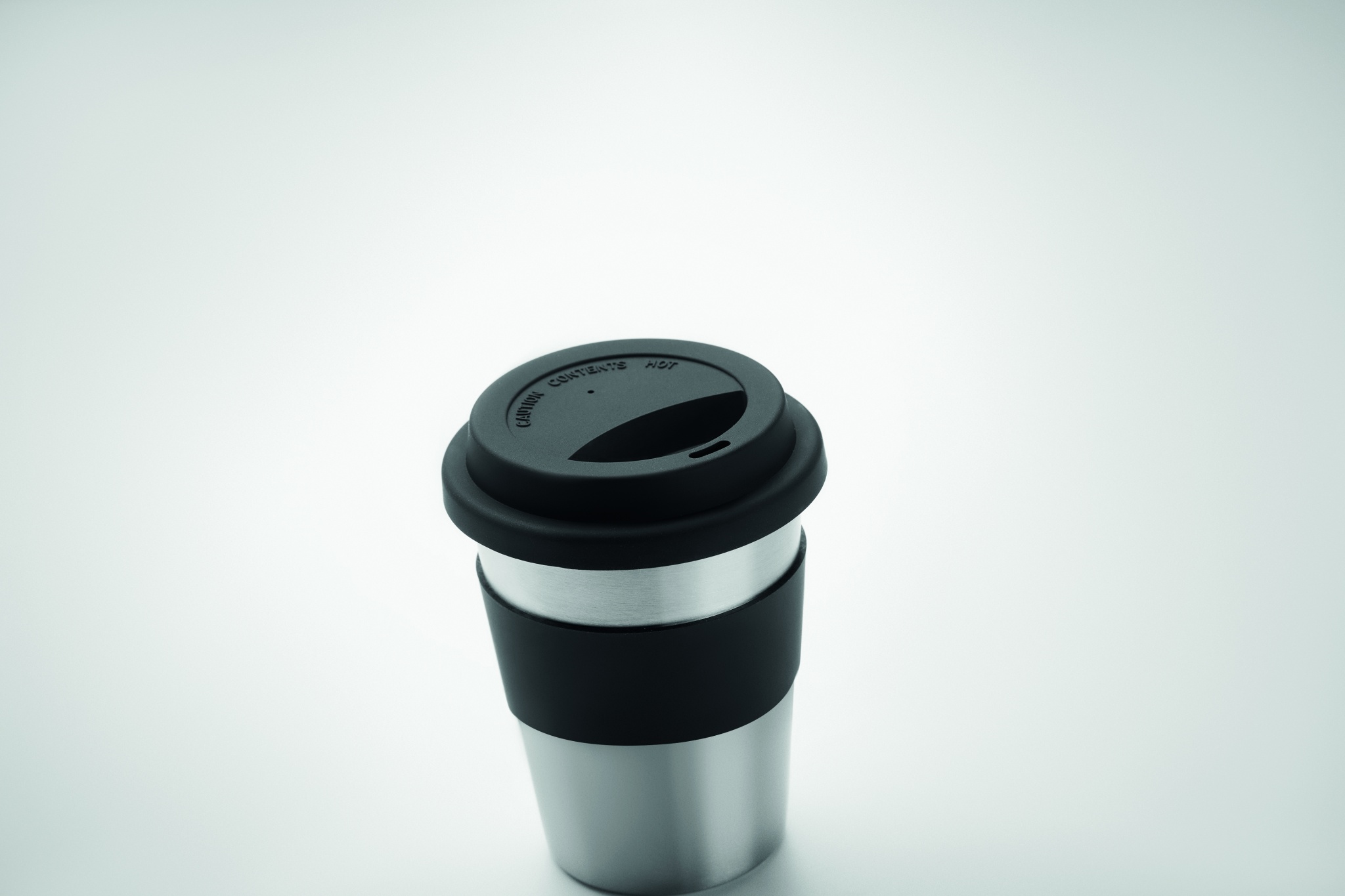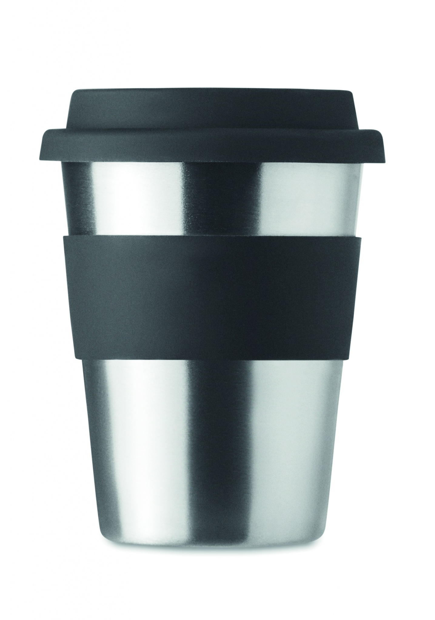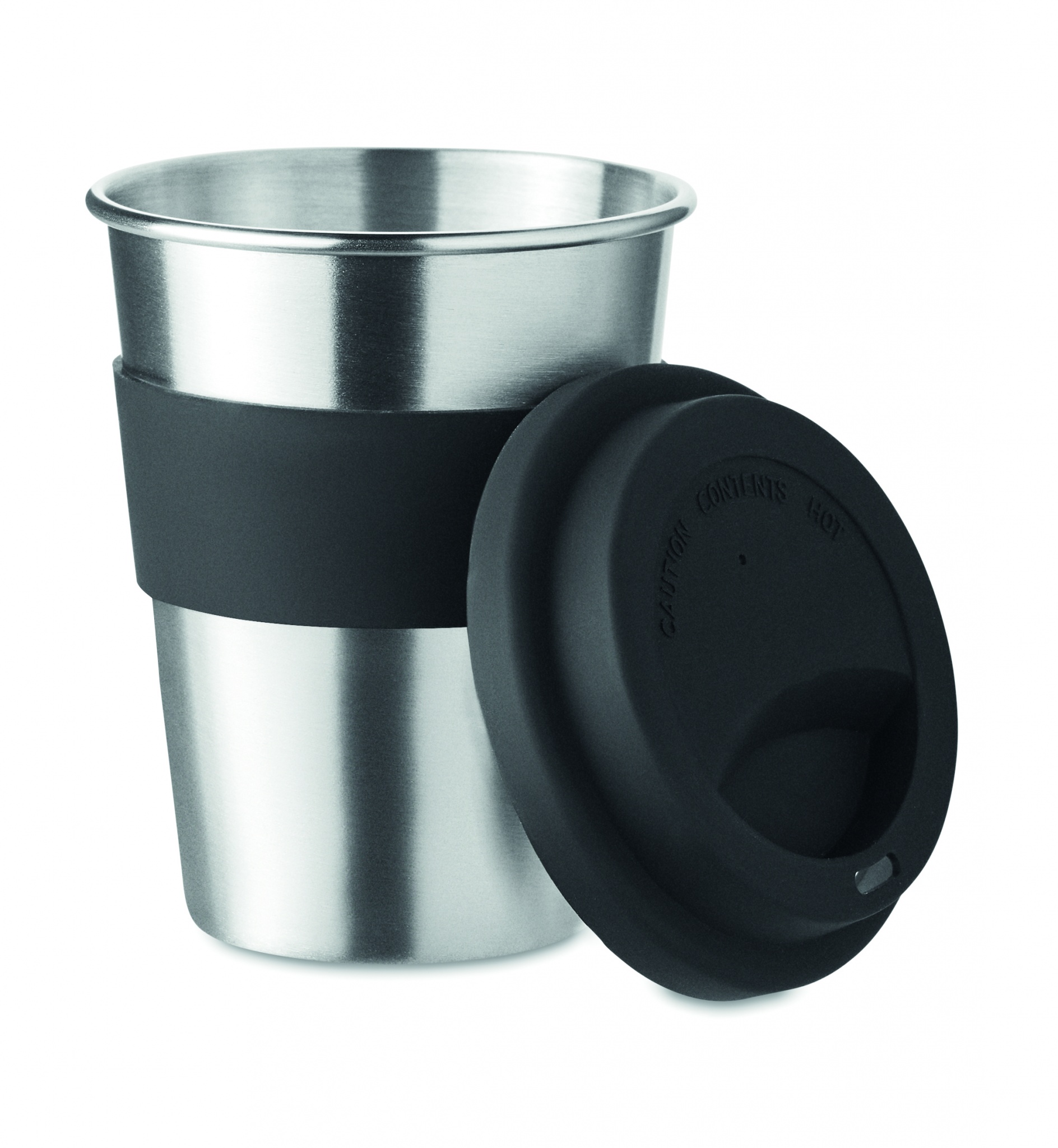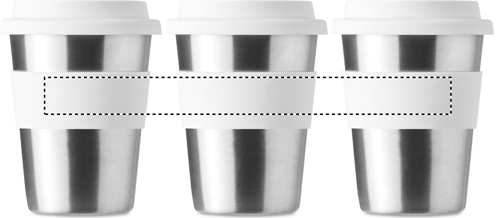 Stainless steel single wall tumbler with silicone lid and grip. Capacity 350 ml. As this is a single walled mug heat transfer can still occur.