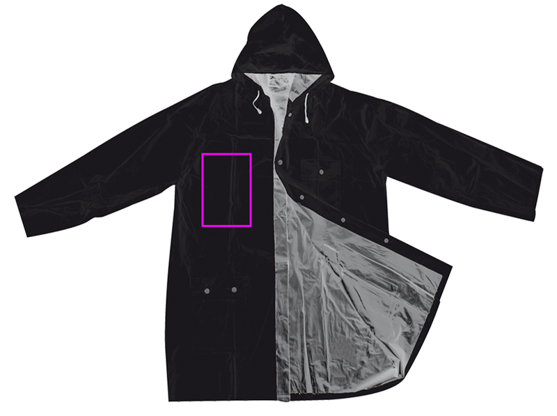 Reversible PVC rain jacket with hood, two pockets and press studs. Back of the coat - 103 x 60 cm.