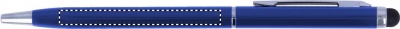 Twist action ball pen in aluminium with stylus and shiny chrome clip. Blue ink.