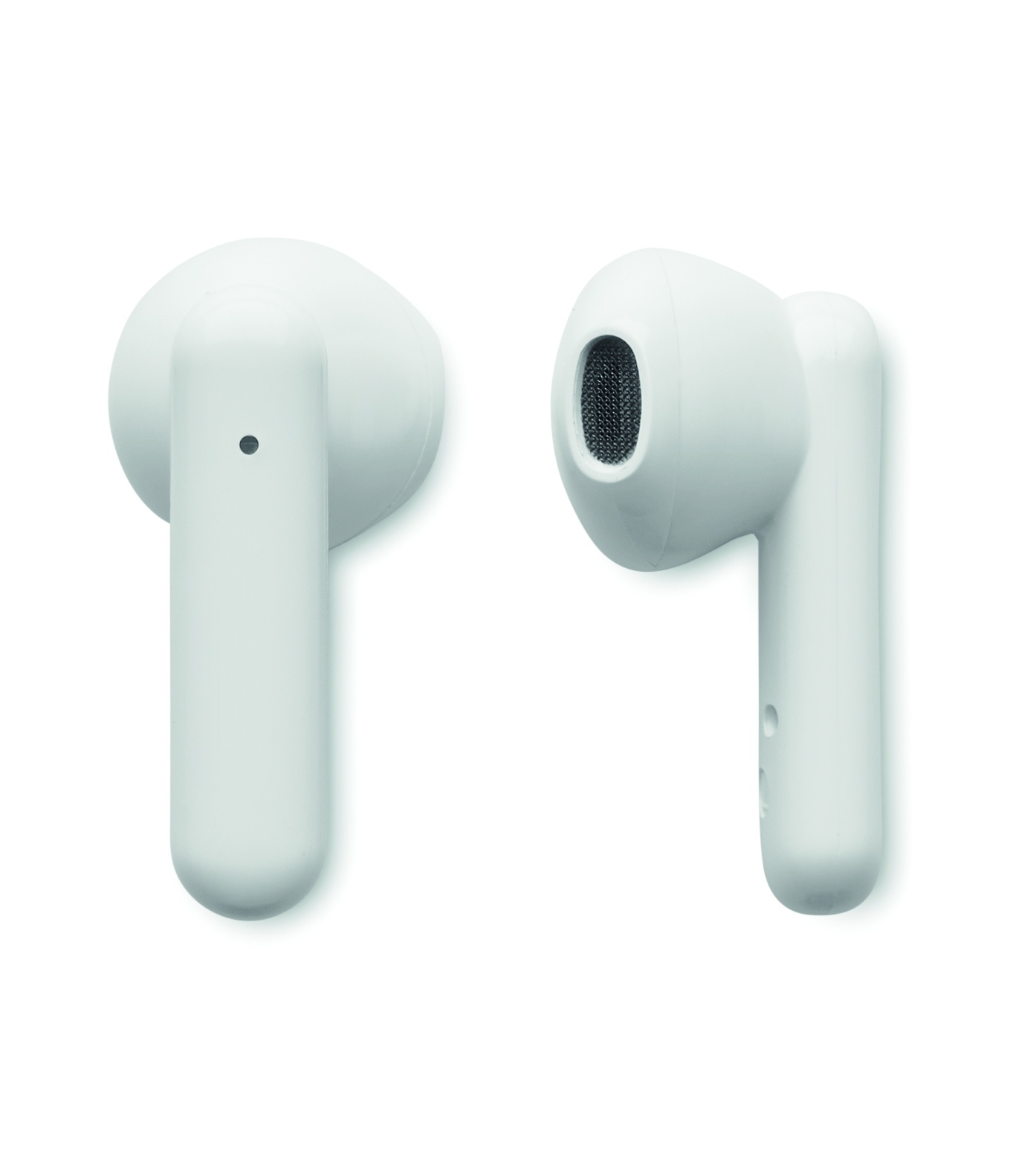 ABS True Wireless Stereo (TWS) 5.3 wireless earbuds with microphone and a 30 mAh battery. Playing time approx. 4 hours. It has a solar charging battery. Auto-pairing. Including a Type C charging cable and a 200 mAh charging station.