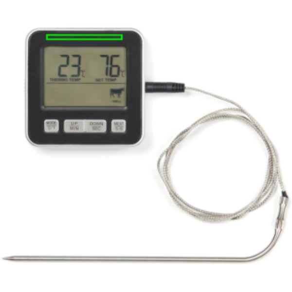 Serve the perfect meal with this handy cooking thermometer. Whether you're roasting succulent roast beef or baking a special cake, this feature-packed thermometer will prove invaluable in the kitchen, whether you are oven cooking, grilling or baking. Timer function and alarm function help you stay in control. The thermometer also displays Celcius and Farenheit so you can adjust it to suit your needs. No kitchen is complete without one.