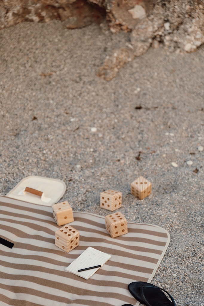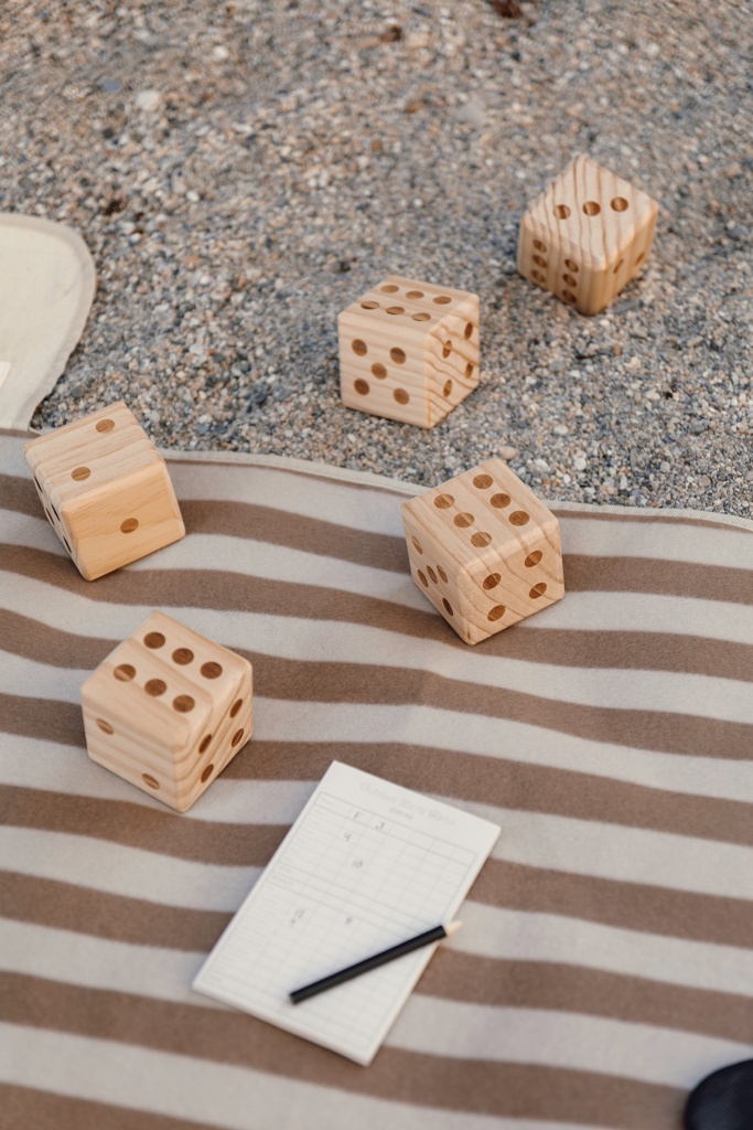The outdoor yacht game is the classic dice game that is perfect for lovely outdoor days. The goal of the game is to get the highest possible score by rolling and combining the dice in different ways. The game is easy to learn and can be played by all ages. 5 dice, measuring 7x7x7cm, a notepad and pencil is included. Packed in a cotton bag. Manual included. All wooden parts are crafted from high-quality FSC®-certified pinewood, ensuring wood from responsibly managed forests.