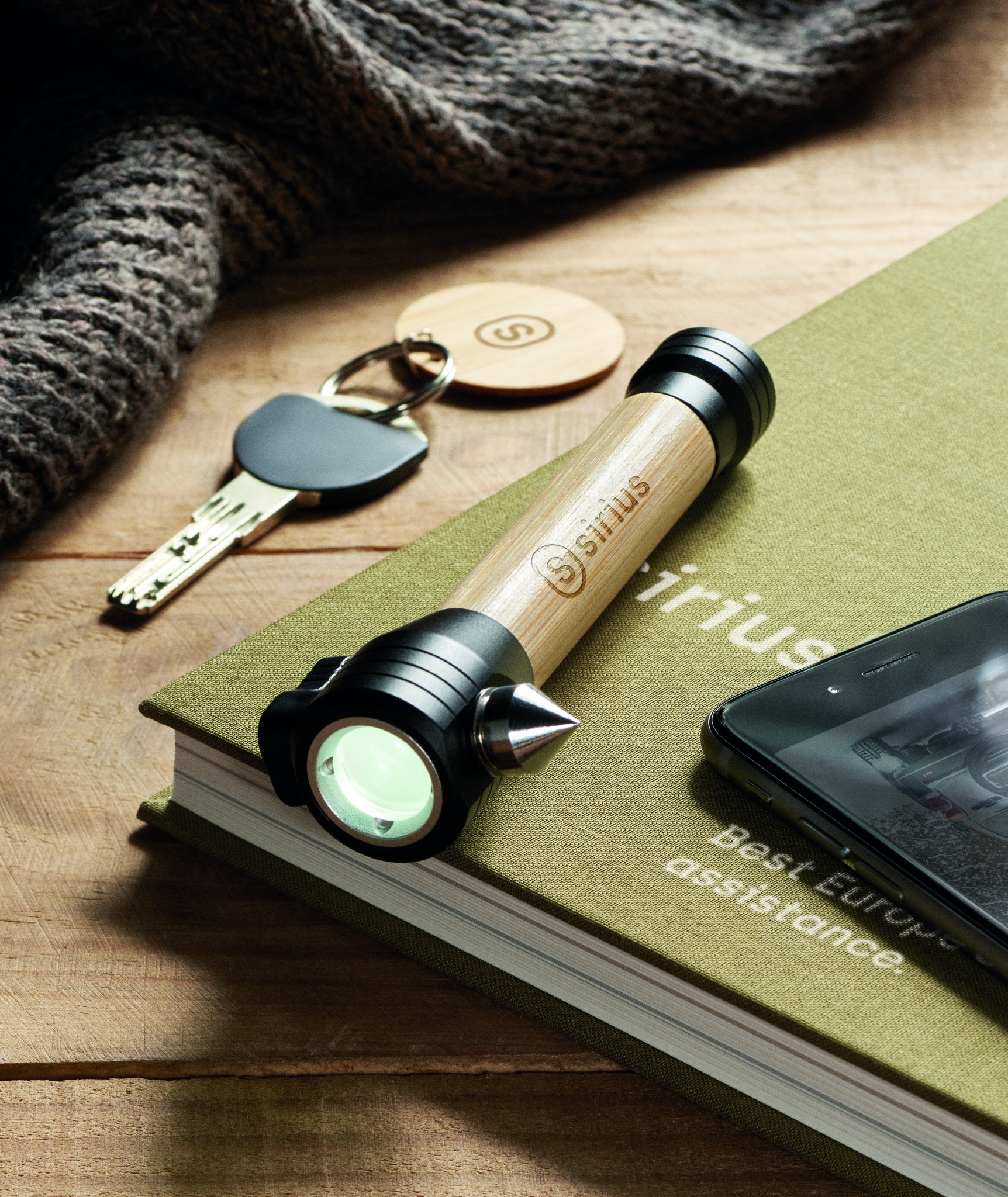 Logotrade firmakingi foto: 3-ühes bambusest taskulamp koos avariivasara ja turvavöölõikuriga