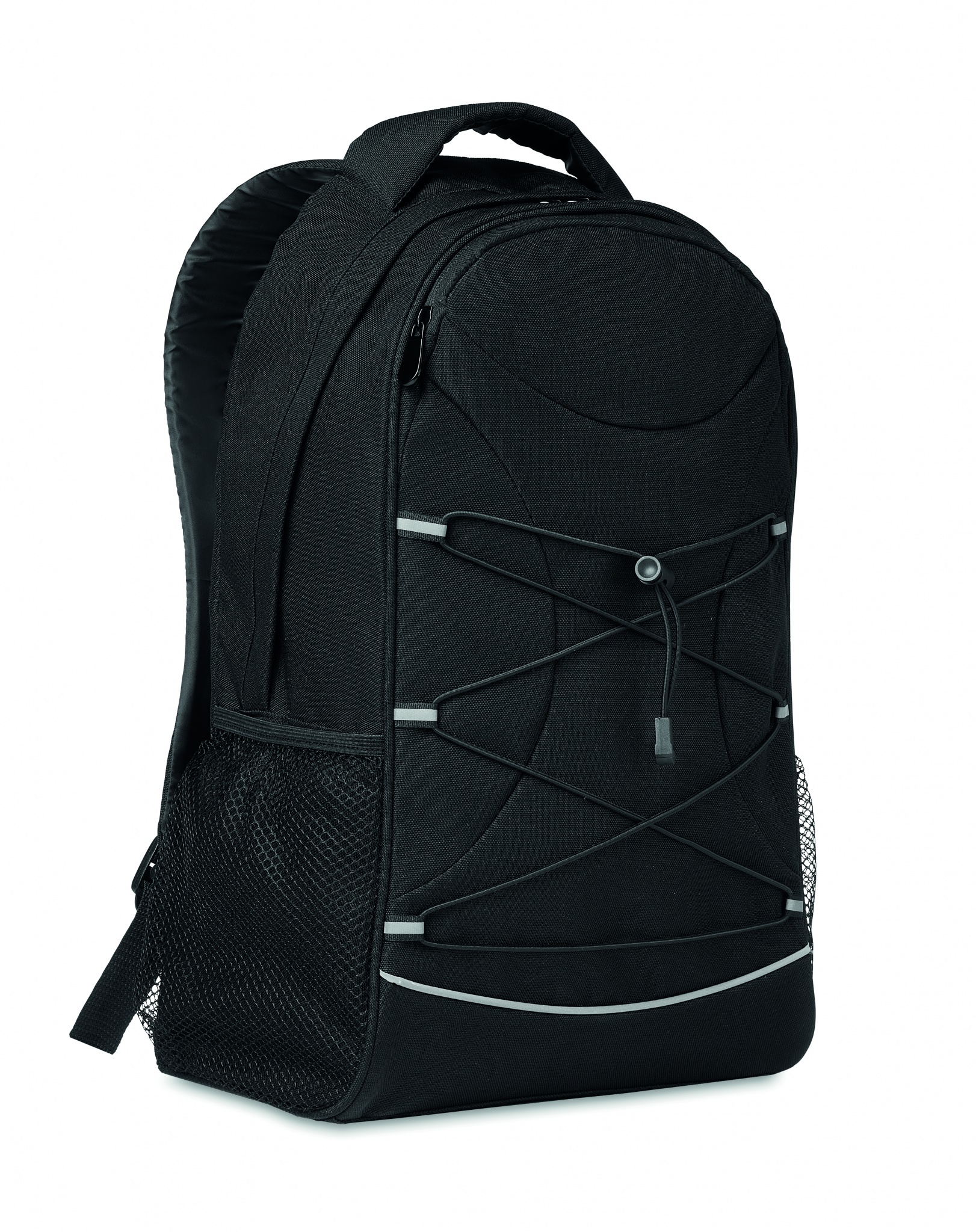 600D RPET seljakott, tumedate nööridega ees ja peegeldava esipaneeli funktsiooniga. Võrktaskud mõlemal küljel.