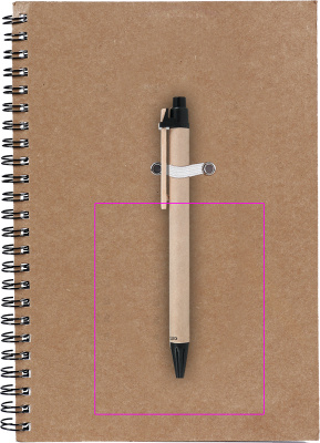 Taaskasutatud papist ja paberist A5 kirjutusplokk 120 joonelise lehega ning taaskasutatud papist sinise tindiga pastakas. Trükime teie logo kaanele.