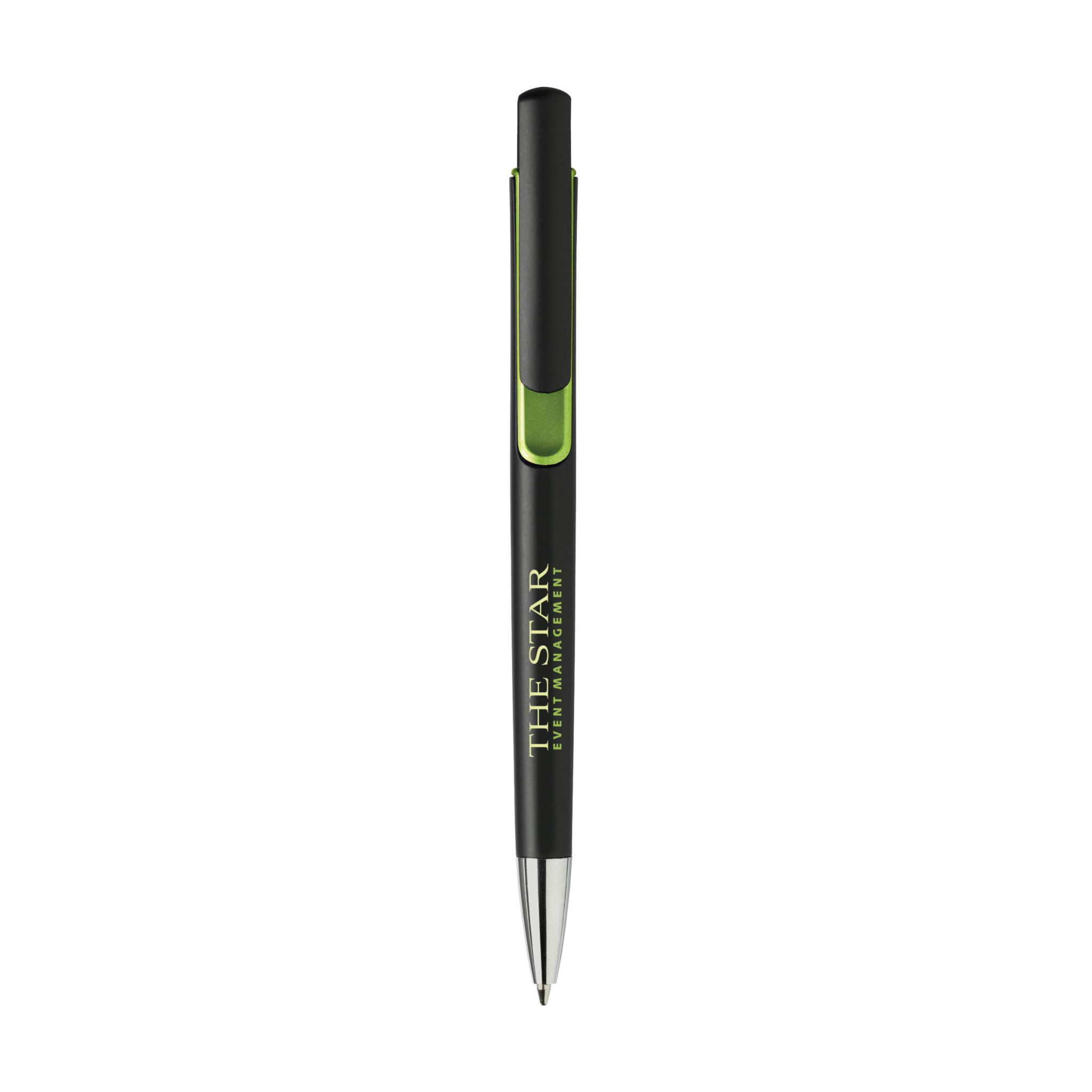 Sinise tindiga pastapliiats mattmusta silindri, silmapaistva disainiga klambri ja metallilise välimusega detailidega.