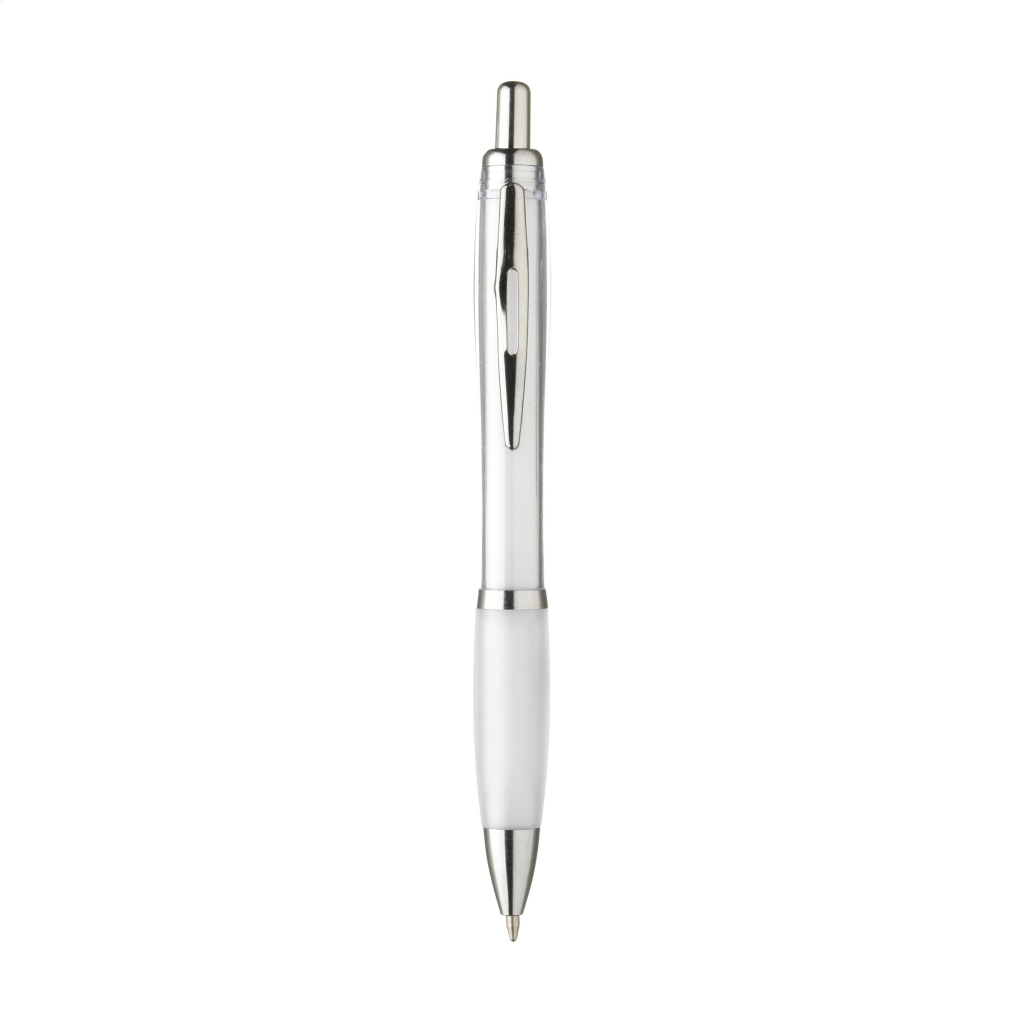 Sinise või musta tindiga pastapliiats läbipaistva värvi silindri, libisemiskindla käepideme ja metallklambriga.