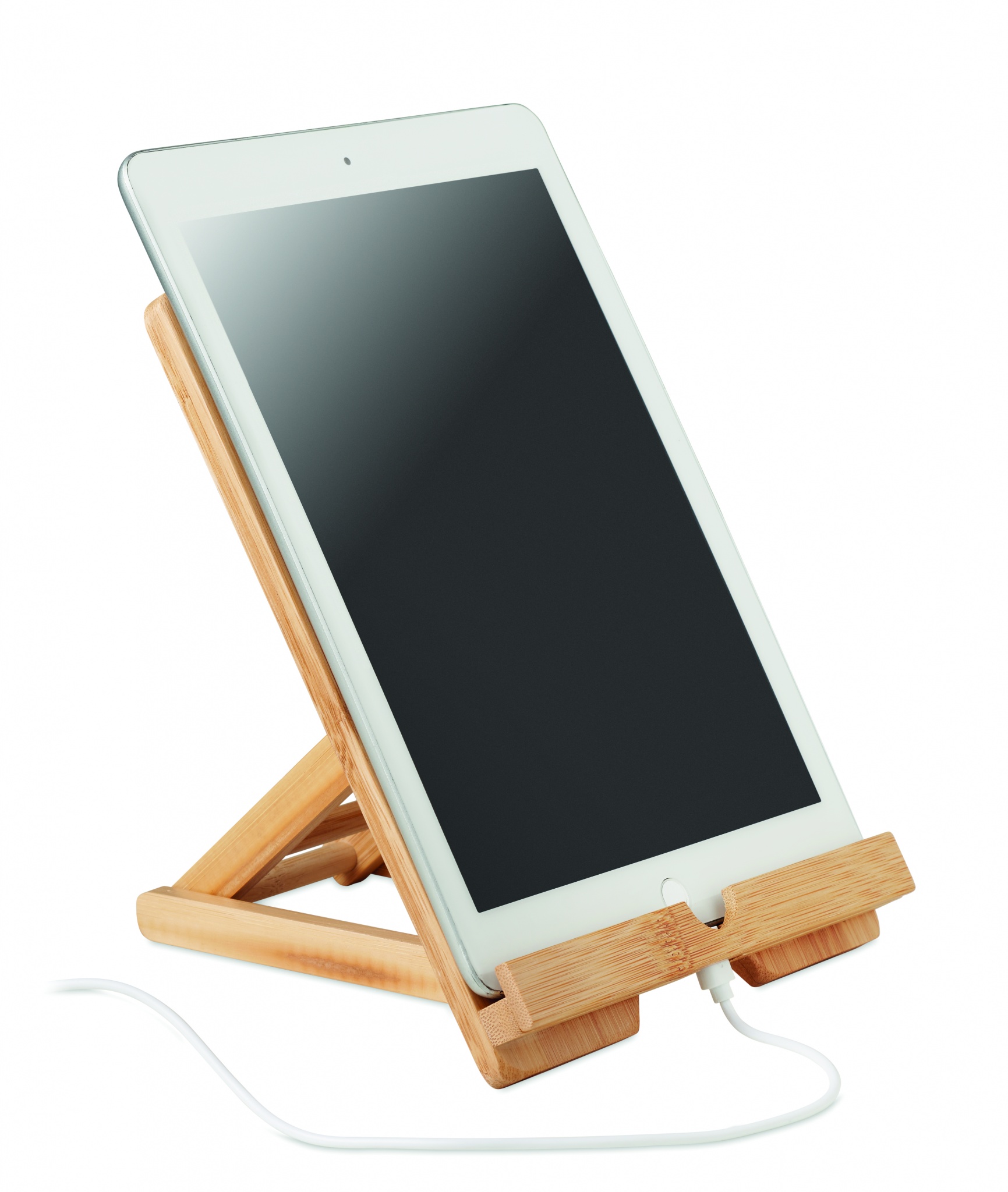 Kokkupandav bambusest tahvelarvuti või nutitelefoni alus. Bambus on looduslik toode, ühe eseme värvis ja suuruses võib esineda väikesi erinevusi, mis võivad mõjutada lõppviimistlust.