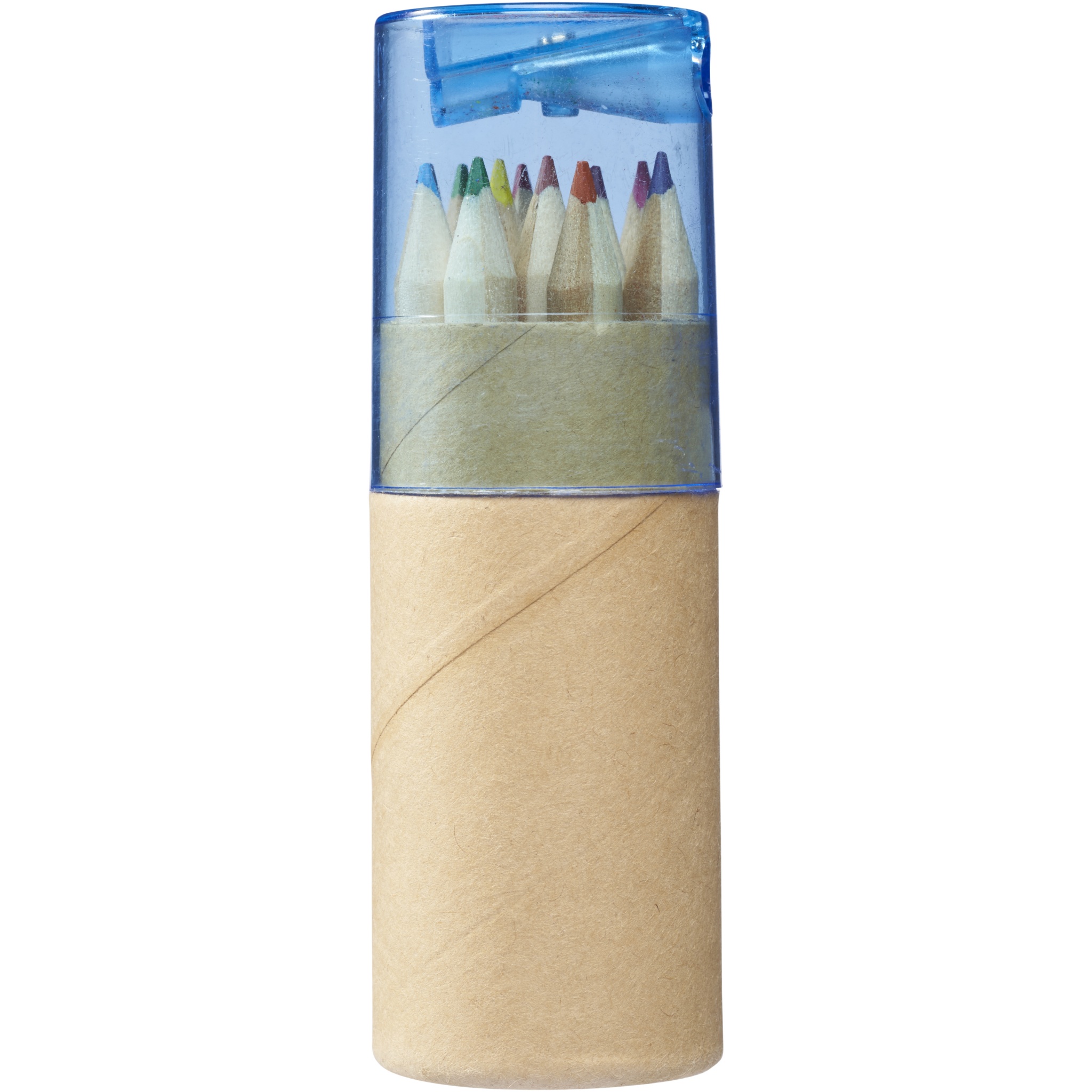 12 värvilist pliiatsit papp-silindriga karbis koos teritajaga plastkaanes. Dekoratsioon pole komponentidel saadaval.