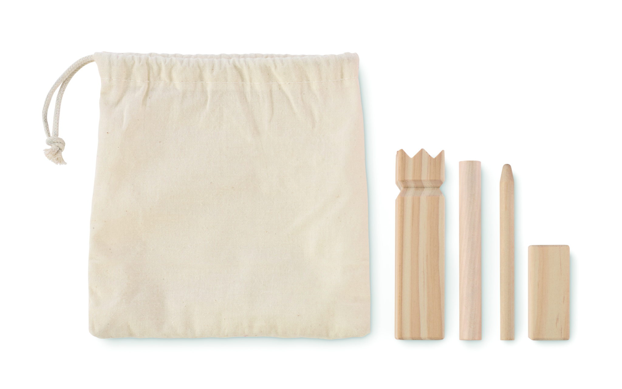 Väike männipuidust viskemäng puuvillases nöörikotis.