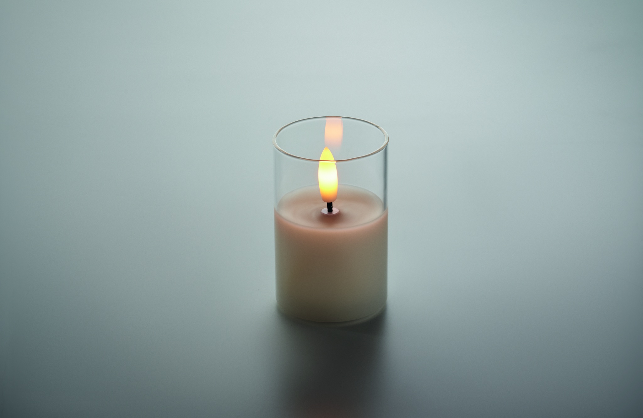Väike tõelise leegiefektiga LED vahaküünal klaasihoidjas. Kaasas CR2032 patarei.