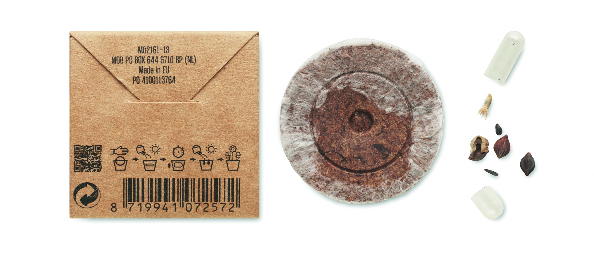 Pressitud turbaketas segatud suvelilleseemnetega pappkarbis. Valmistatud EL-is.