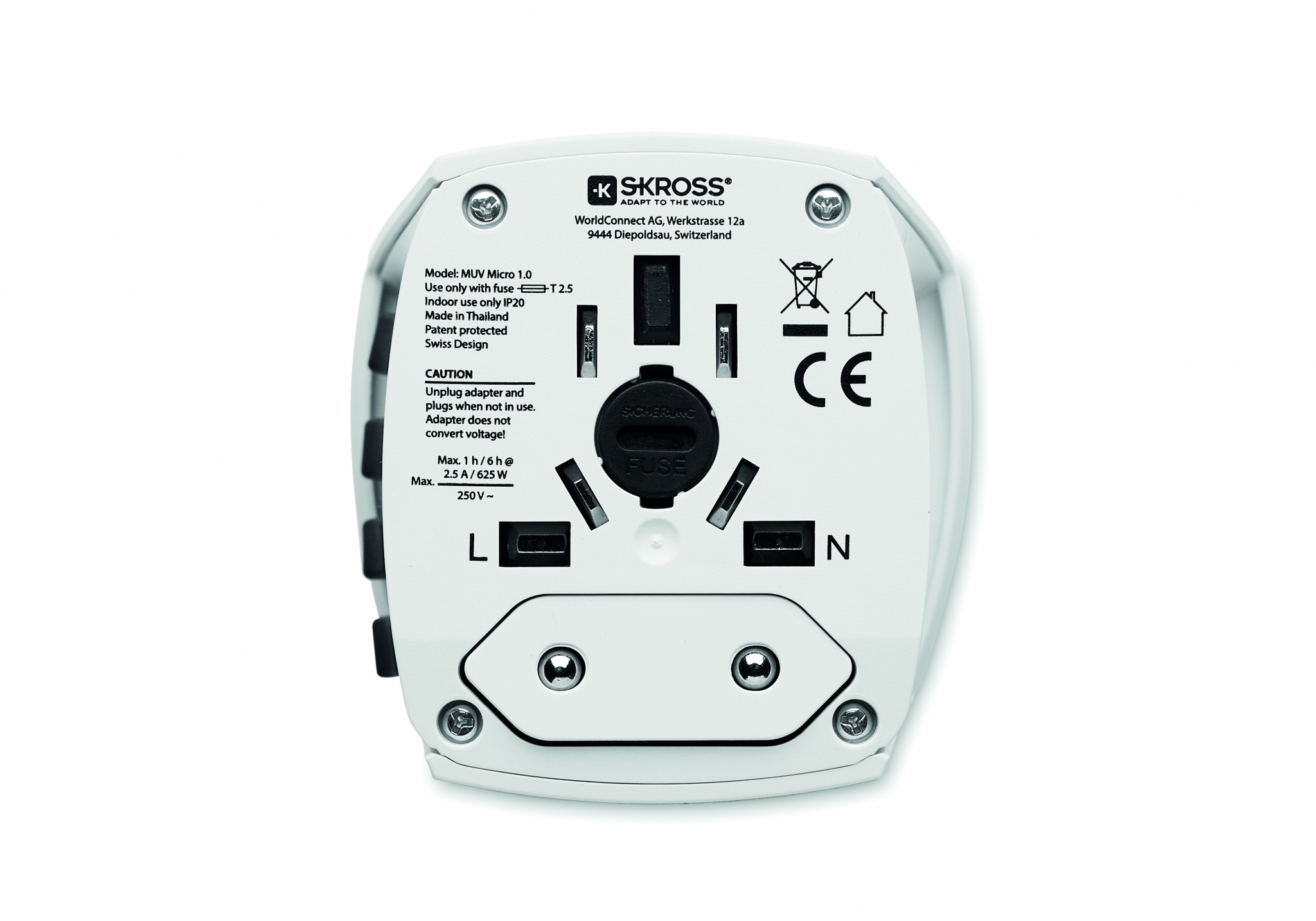 Universaalne SKROSS® reisiadapter. Nõud Euroopa, USA/Jaapan, Austraalia/Hiina jaoks.   2-poolne, maandamata. Täidab kõiki rahvusvahelisi turvalisusega seotud standardeid ja norme. Isegi lapsele ohutu.
