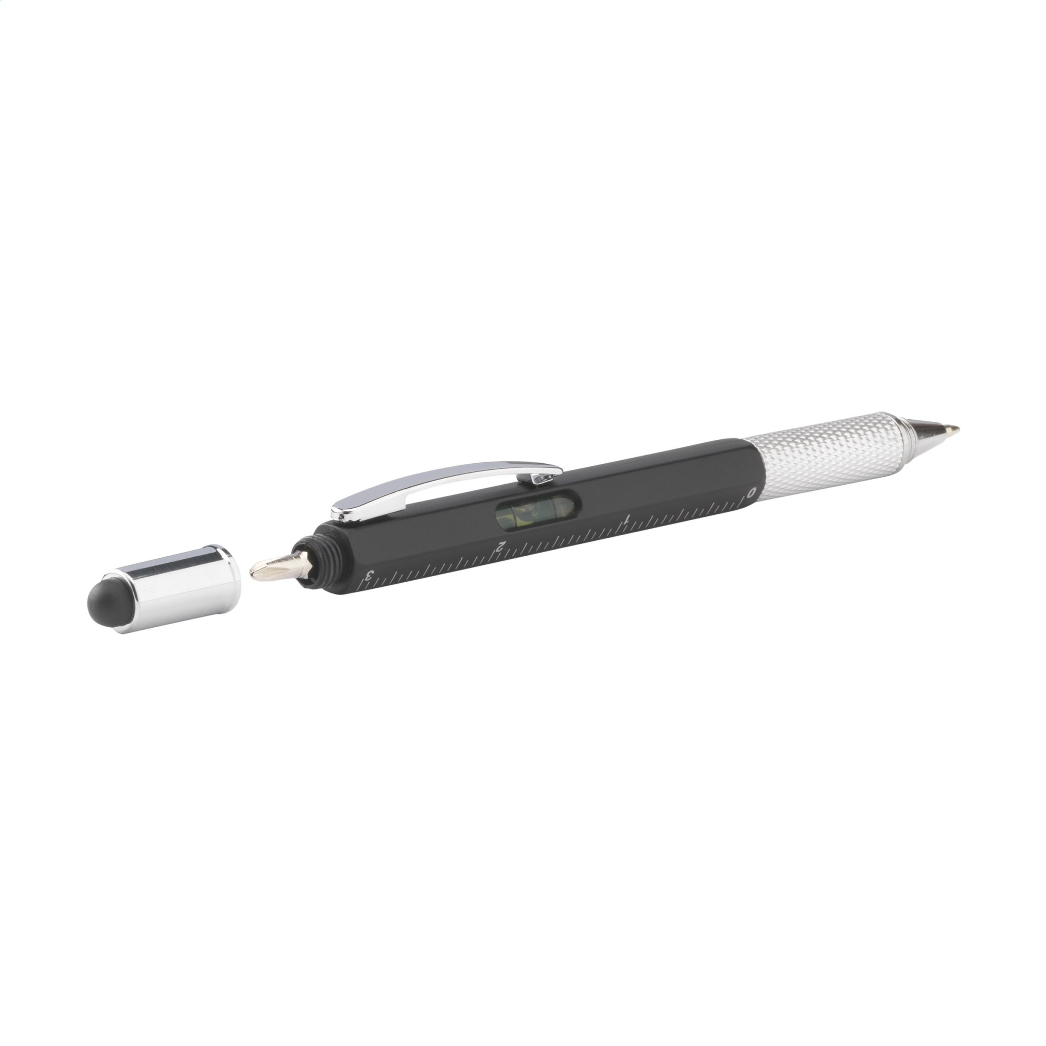 Multifunktsionaalne ABS materjalist pastapliiats. Joonlauaga (7 cm/3 tolli), vesiloodi, kruvikeeraja ja pliiatsi funktsiooniga. Pliiatsil on sinine tint, metallklamber ja keeramismehhanism.