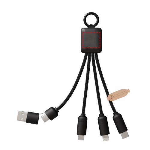 Viis-ühes laadimiskaabel 3 pistikuga (C-tüüp, Android, iPhone) ja rPET-juhtmed (valmistatud taaskasutatud plastpudelitest). Tänu kahele USB-A + USB-C sisendile ühildub kaabel 100% turul uusimate arvutitega (USB-C). Otsakatete metallilise välimusega viimistlus. Kaabliga saab korraga laadida kuni 3 seadet. Tarnitakse taaskasutatavas ümbrises ja taaskasutatud paberkaardis.