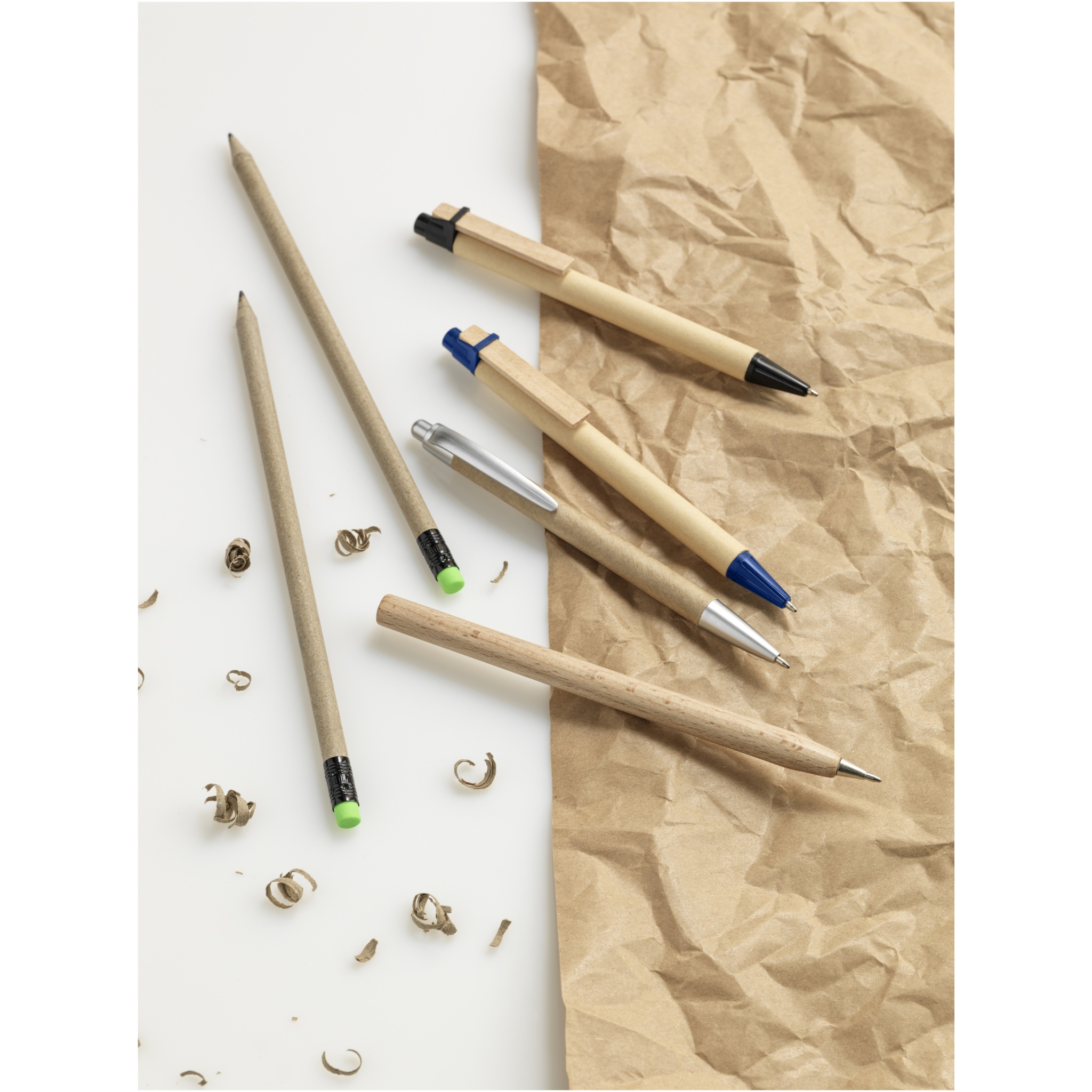 Keskkonnasõbralik pastapliiats, millel on klõpsamismehhanism, taaskasutatud paberist toru ja hõbedase pihustatud ABS-kaunistused. Taaskasutatud paberi värv võib erineda.