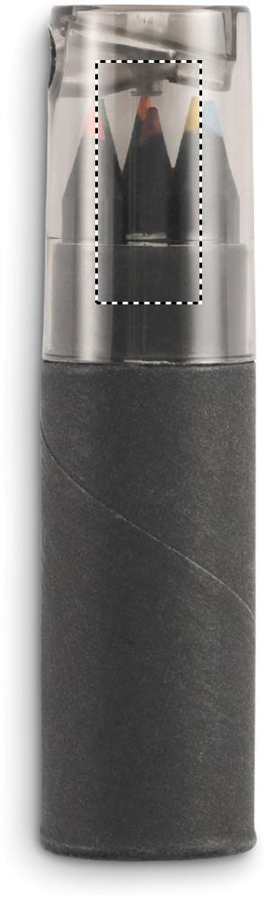 Mustanvärinen paperiputkilaatikko sisältää 6 värikynää ja lyijykynänteroittimen laatikon kannessa.