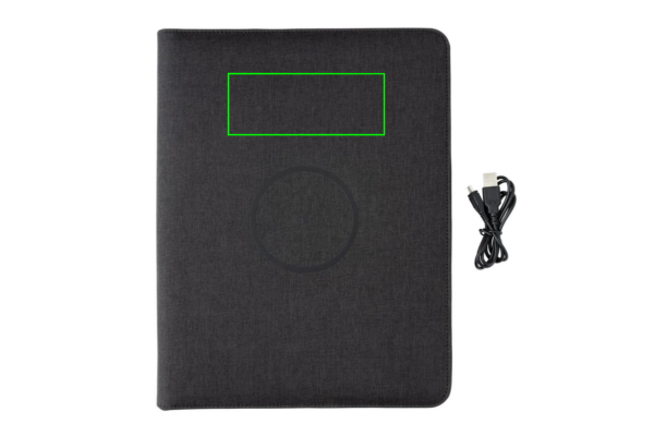 Tämä A4 portfolio, jossa on 20 kermanväristä viivoitettua 70 gramman paperiarkkia muistiona, edustaa uusinta tekniikkaa. Etukannessa on langaton latausalusta puhelintasi varten. (Androidin uusimmat sukupolvet, iPhone 8 ja uudemmat.) Vanhemmat puhelimet ja tabletit voidaan ladata USB-liitäntöjen kautta 5 000 mAh varavirtalähteen avulla. Sisääntulo: 5,0 V/2,1 A. Ulostulo 1: 5,0 V/2,1 A. Ulostulo 2: 5,0 V/2,1 A. Langaton ulostulo: 5W. Rekisteröity malli®