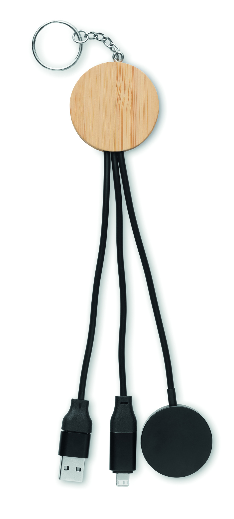 Avaimenperä 4 in 1 -latauskaapeli 60W bambu yksityiskohdilla. Tulo: 2-in-1 Type-C ja Type-A. Lähtö: Kellon lataus (Samsung® ja Apple®) , Type-C ja micro-B (2 in 1 pin).