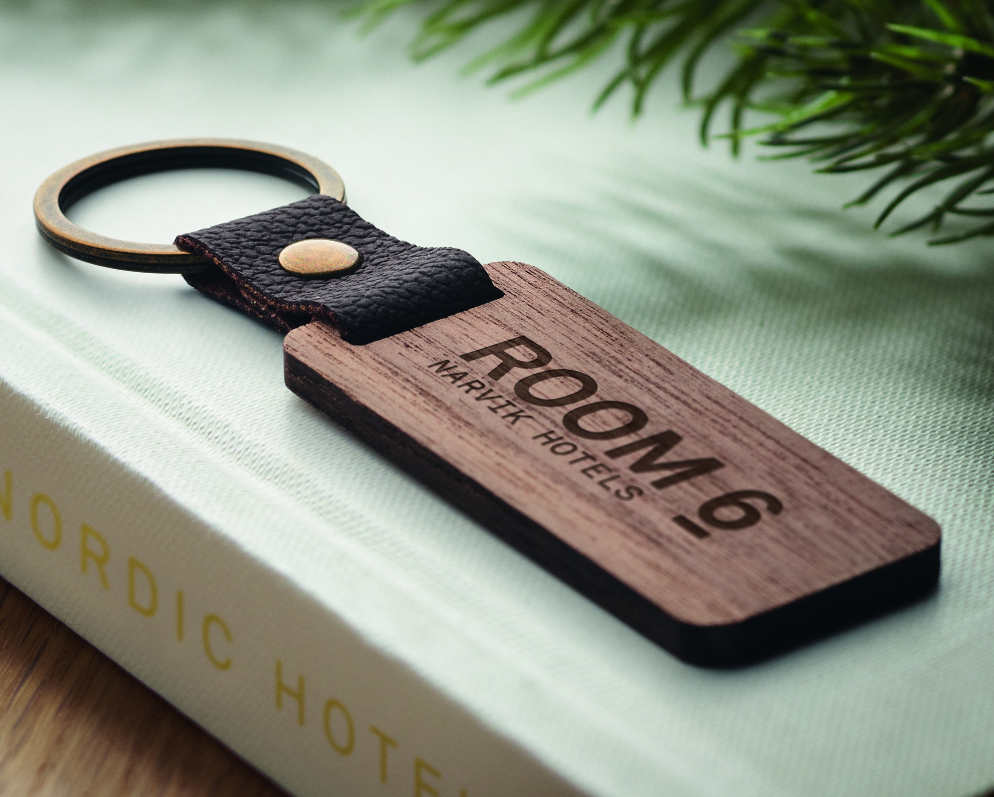 Logo trade liikelahjat tuotekuva: Avaimenperä pähkinäpuuta ja PU Kokkola
