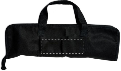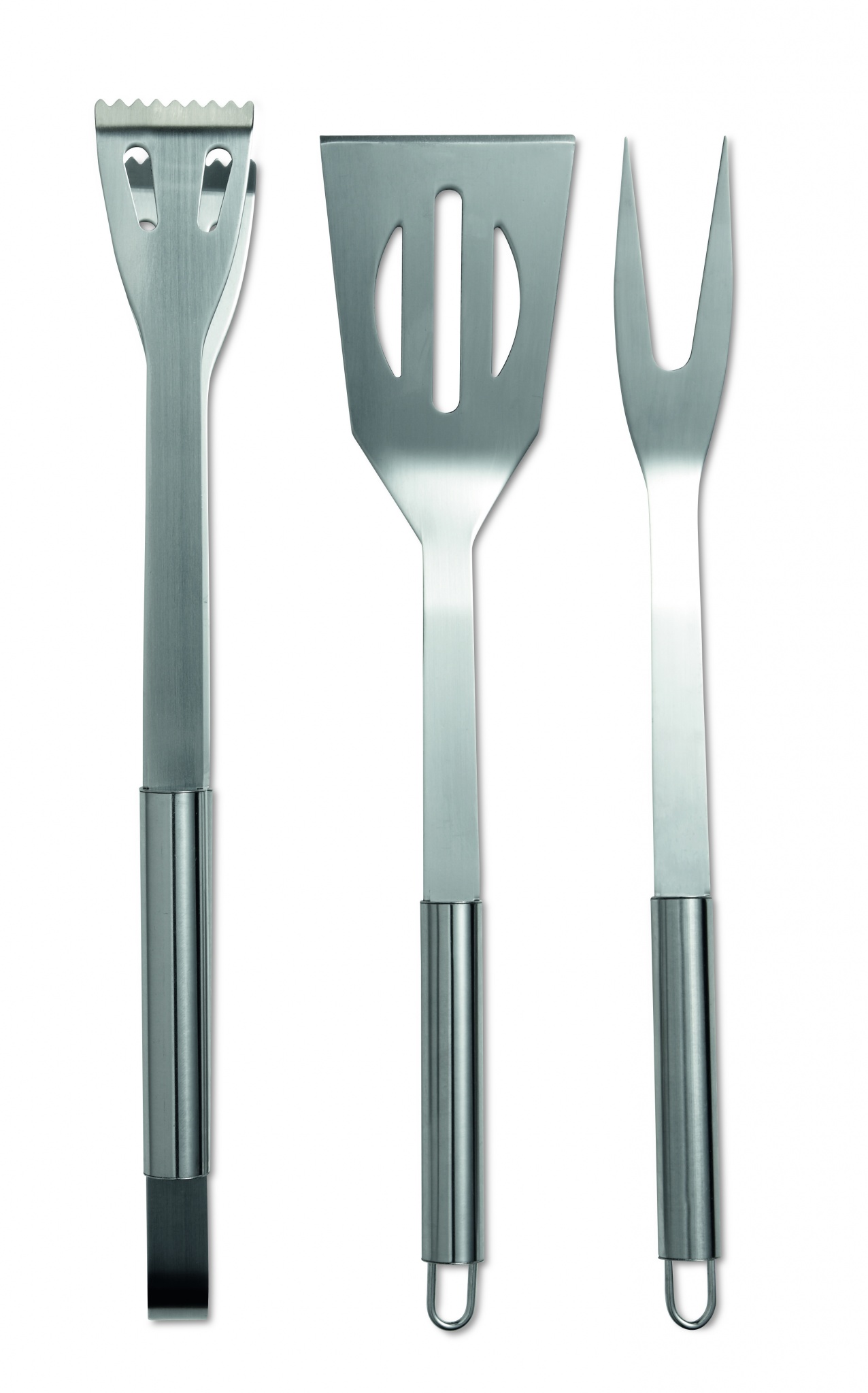 Kolme ruostumattomasta teräksestä valmistettua grilli atulaa, pakattuna vetoketjulliseen kuitukangaspussiin.