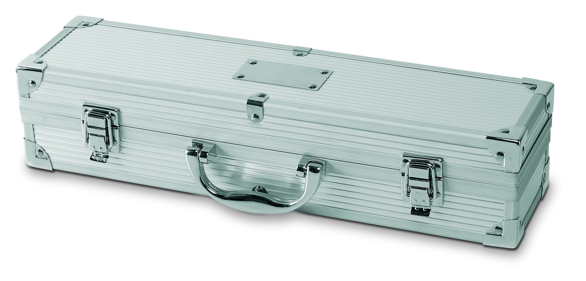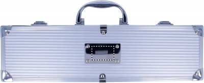 3 osainen grillisetti alumiinilaatikossa, laatikon kannessa levypaikka painatukselle.