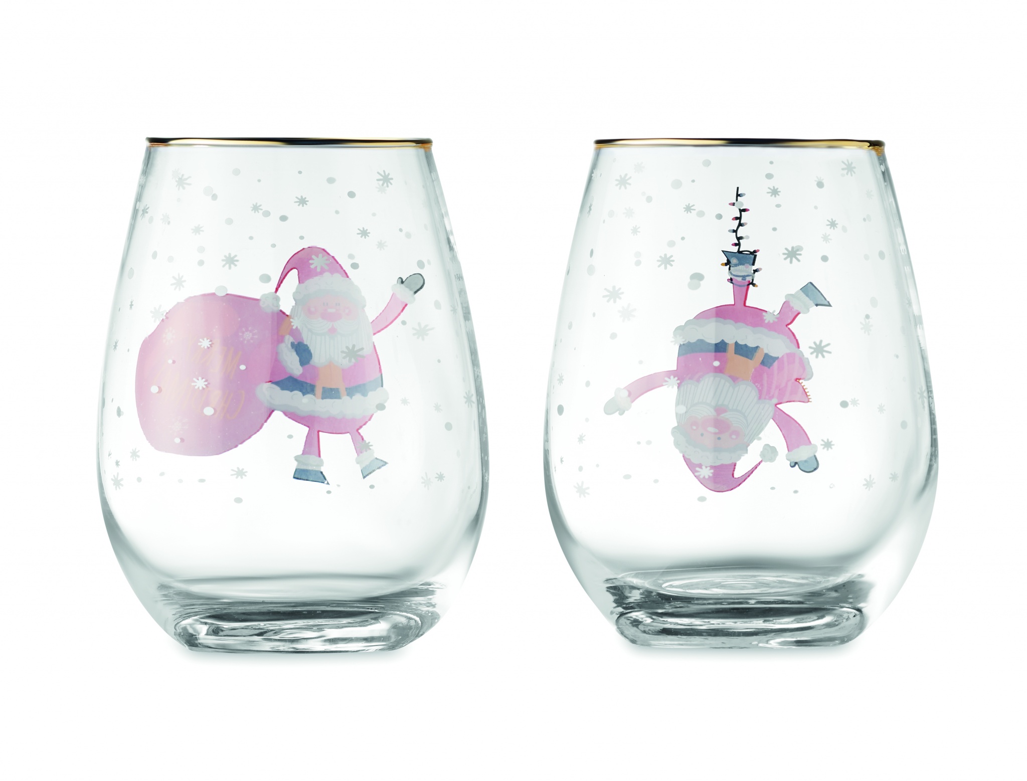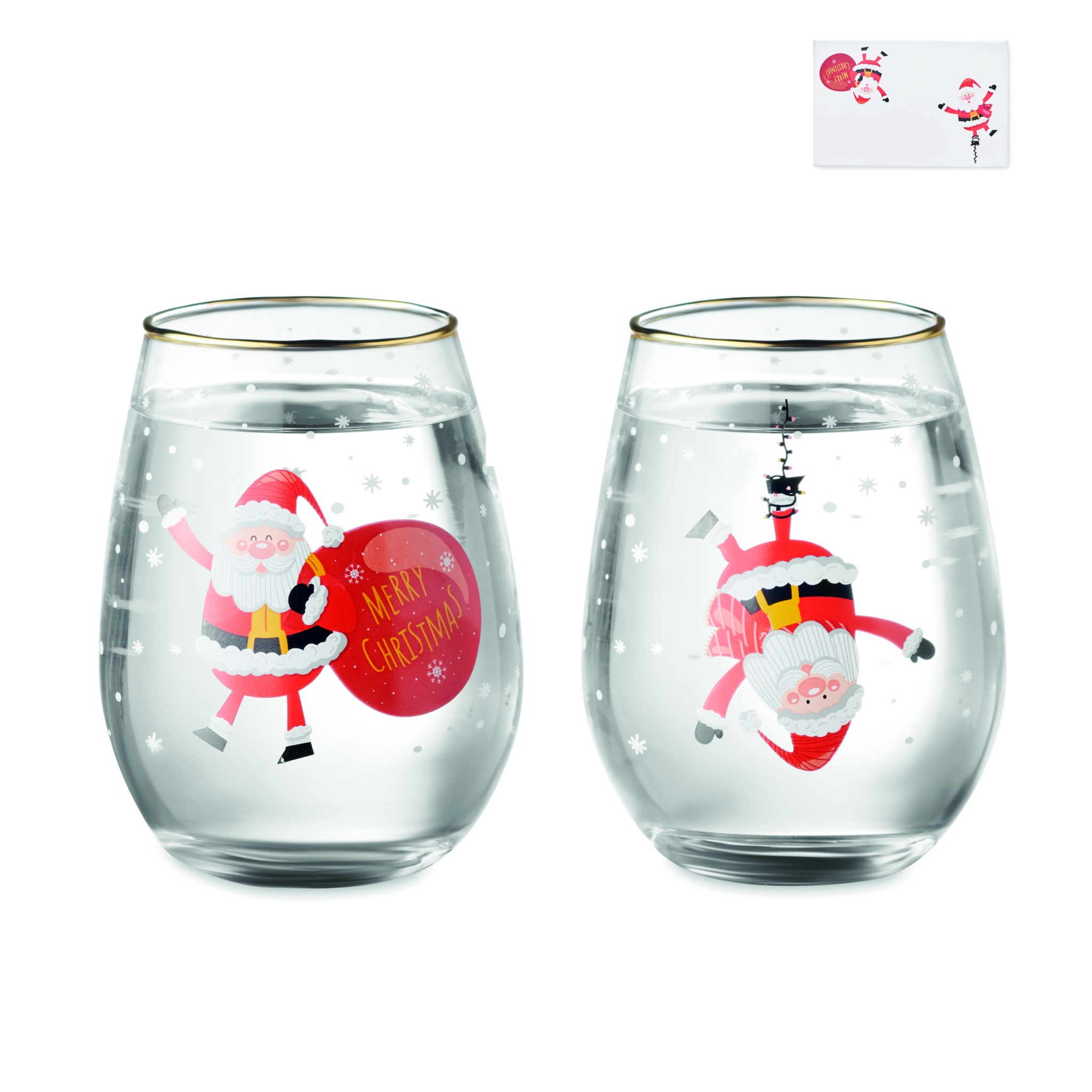 2 jouluaiheista 330 ml juomalasia, kultaisella reunuksella. Pakattuna lahjapakkaukseen.
