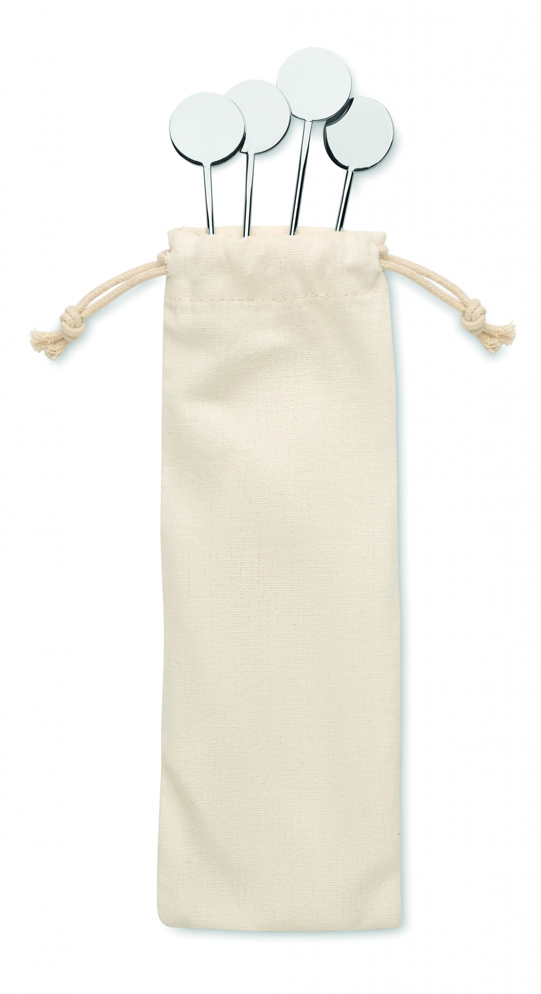 4 ruostumattomasta teräksestä valmistettua juomasekoitinta, puuvillapussissa.