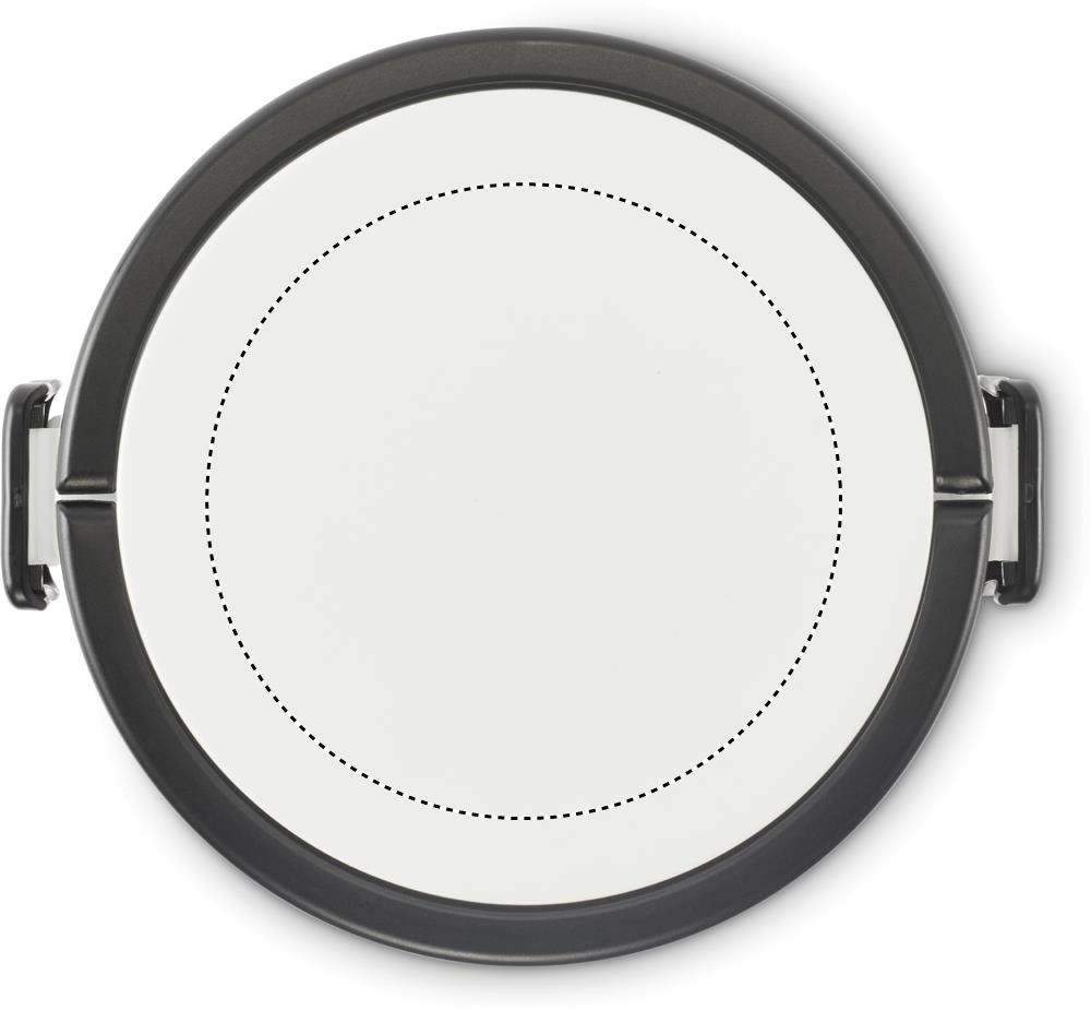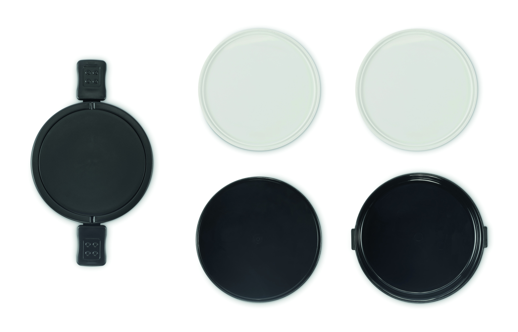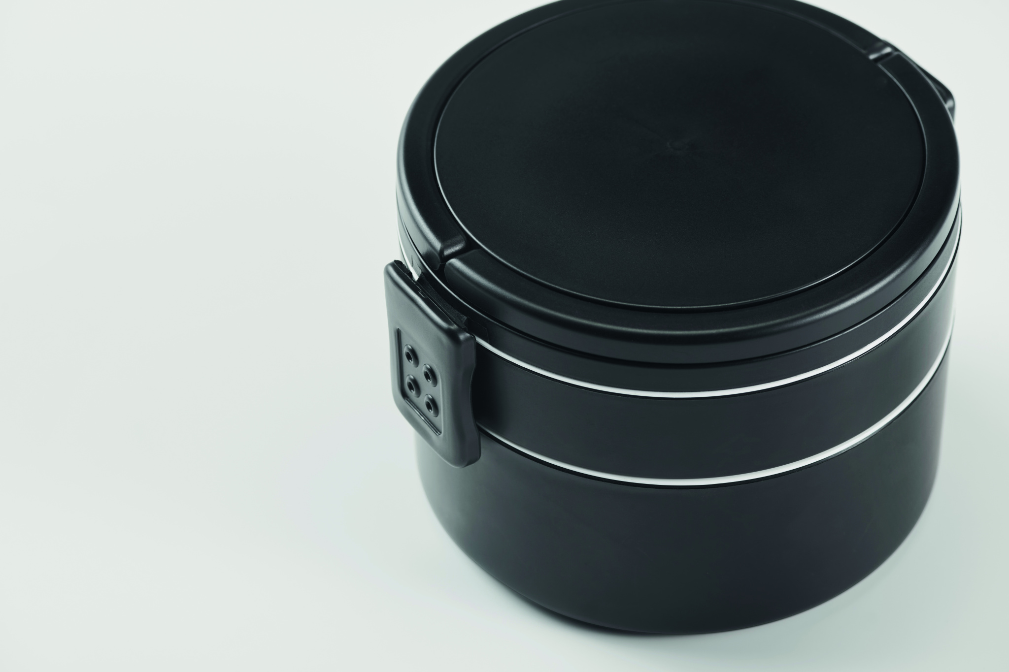 Kaksikerroksinen pyöreä lounasrasia PP-muovista, sivussa klipsukiinnitys ja kahvat. Sisältää valkoiset sisäkannet. Tilavuus 250 ml yläosasta, 700 ml alaosasta.