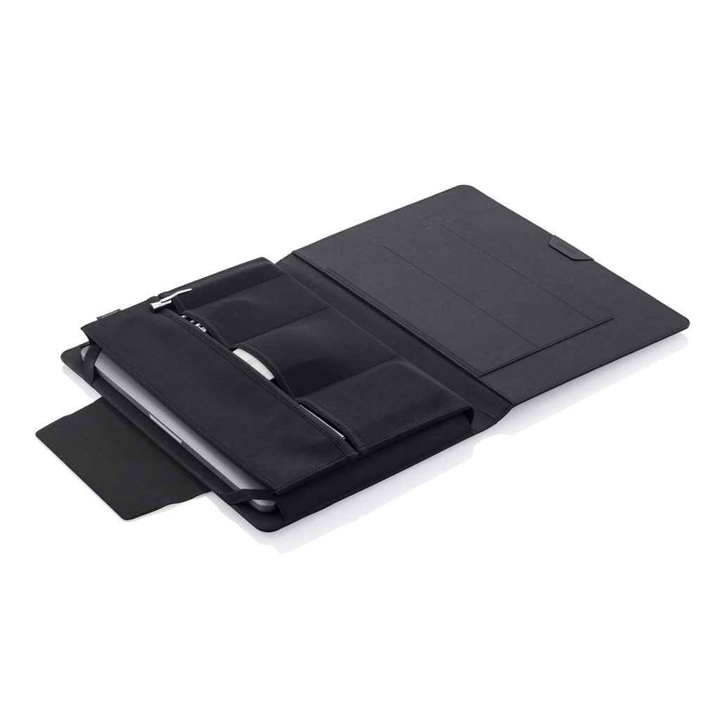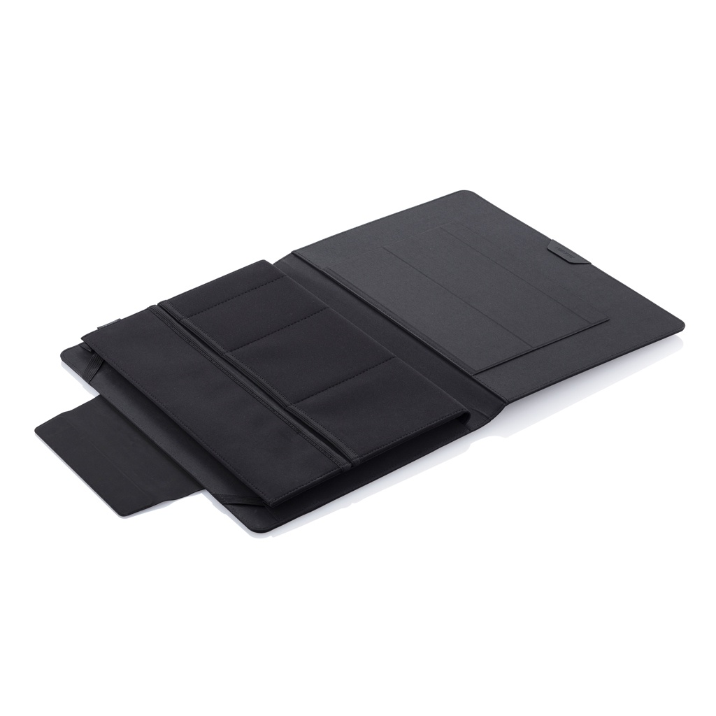 Minne ikinä menetkin, kanna toimistosi mukanasi! Tämä innovatiivisella taitettavalla muotoilulla varustettu kannettava työasema pitää toimistotarvikkeesi kätevästi järjestyksessä. Yksinkertaisesti avaa ja käytä magneettijalustoja asettaaksesi kannettava tietokoneesi oikeaan asentoon tai käytä sisäpintaa hiirimattona. Kannettavaan toimistoon mahtuu 13" kannettava tietokone ja enintään 12,9" tabletti. Rekisteröity design®