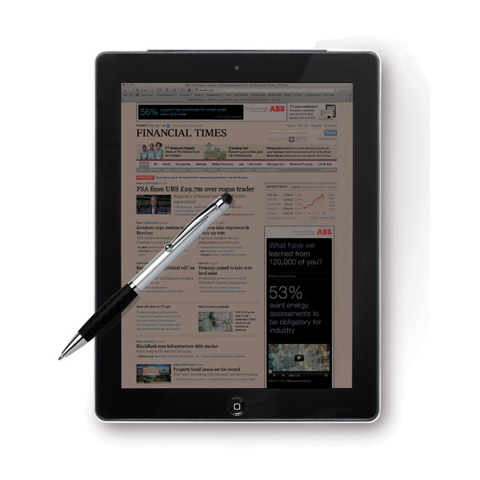 ABS- muovinen kuulakärkikynä kiertomekanismilla ja kosketusnäyttöpäällä. Metallimainen lopputulos ja pehmeä grippi, sininen muste.